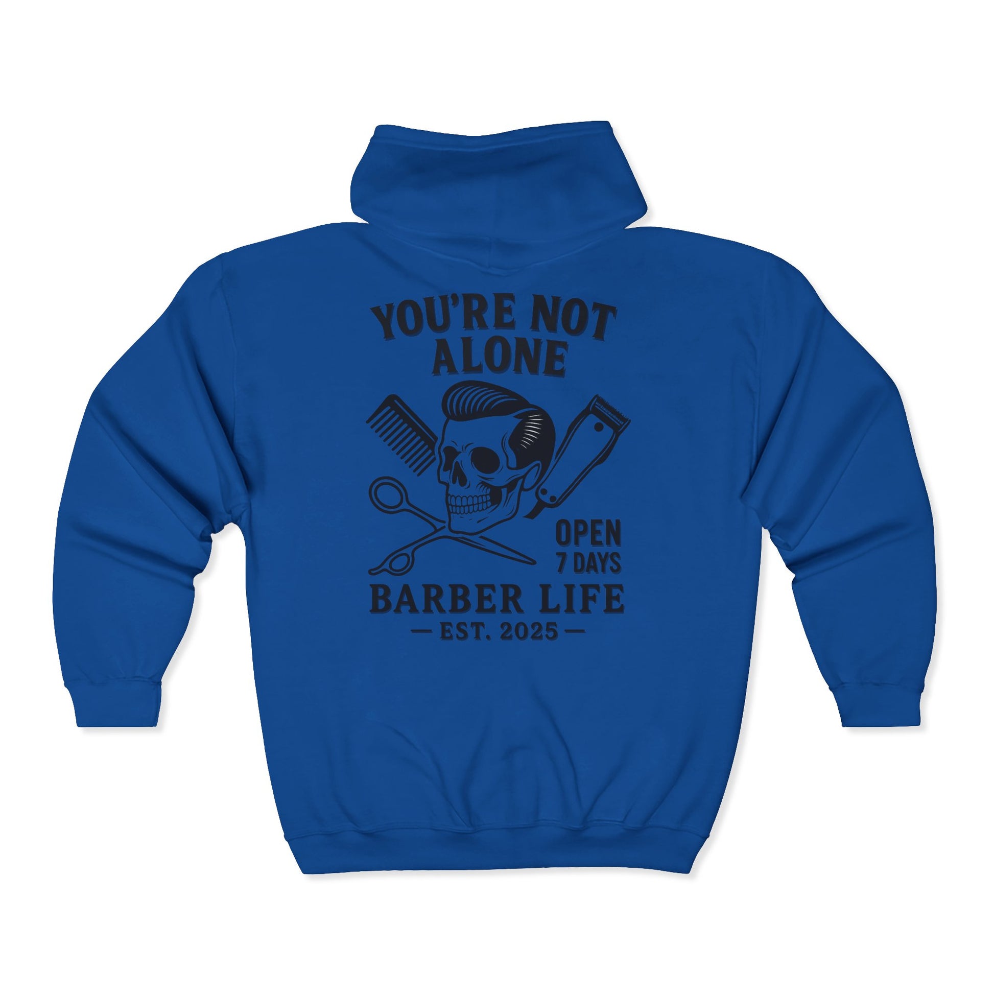With its crisp black-and-white graphic, subtle “You’re Not Alone” message, and a bold “OPEN 7 DAYS” red tag, it’s built to stand out in the shop or the street.