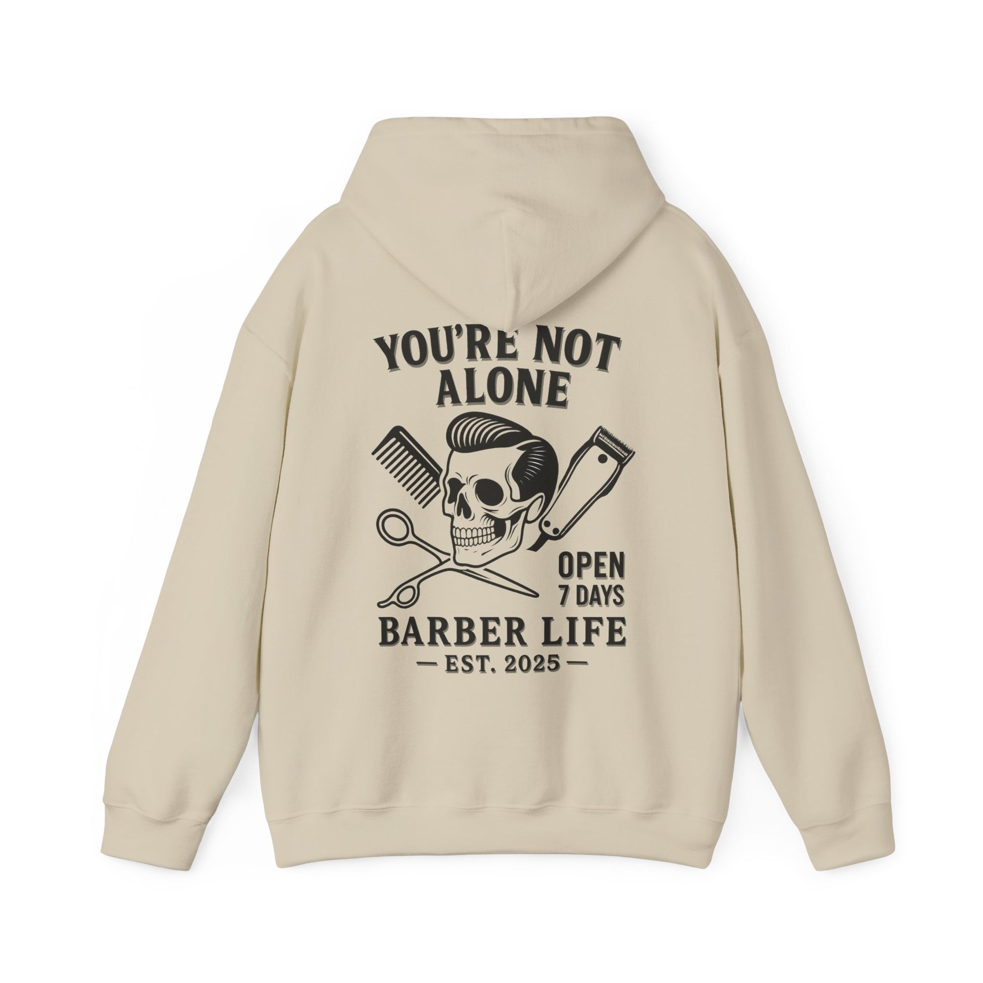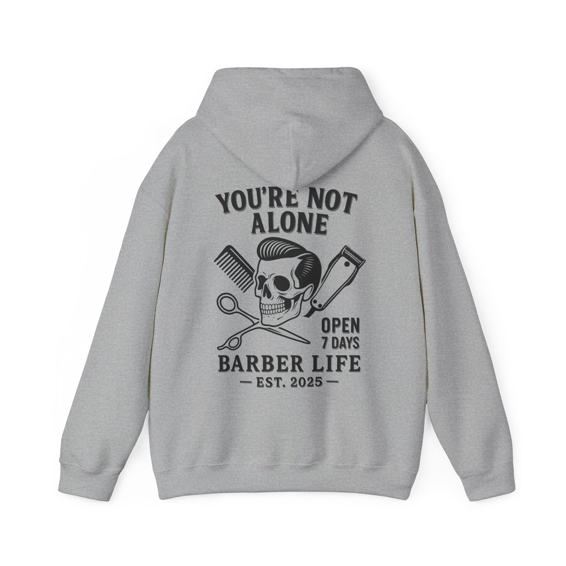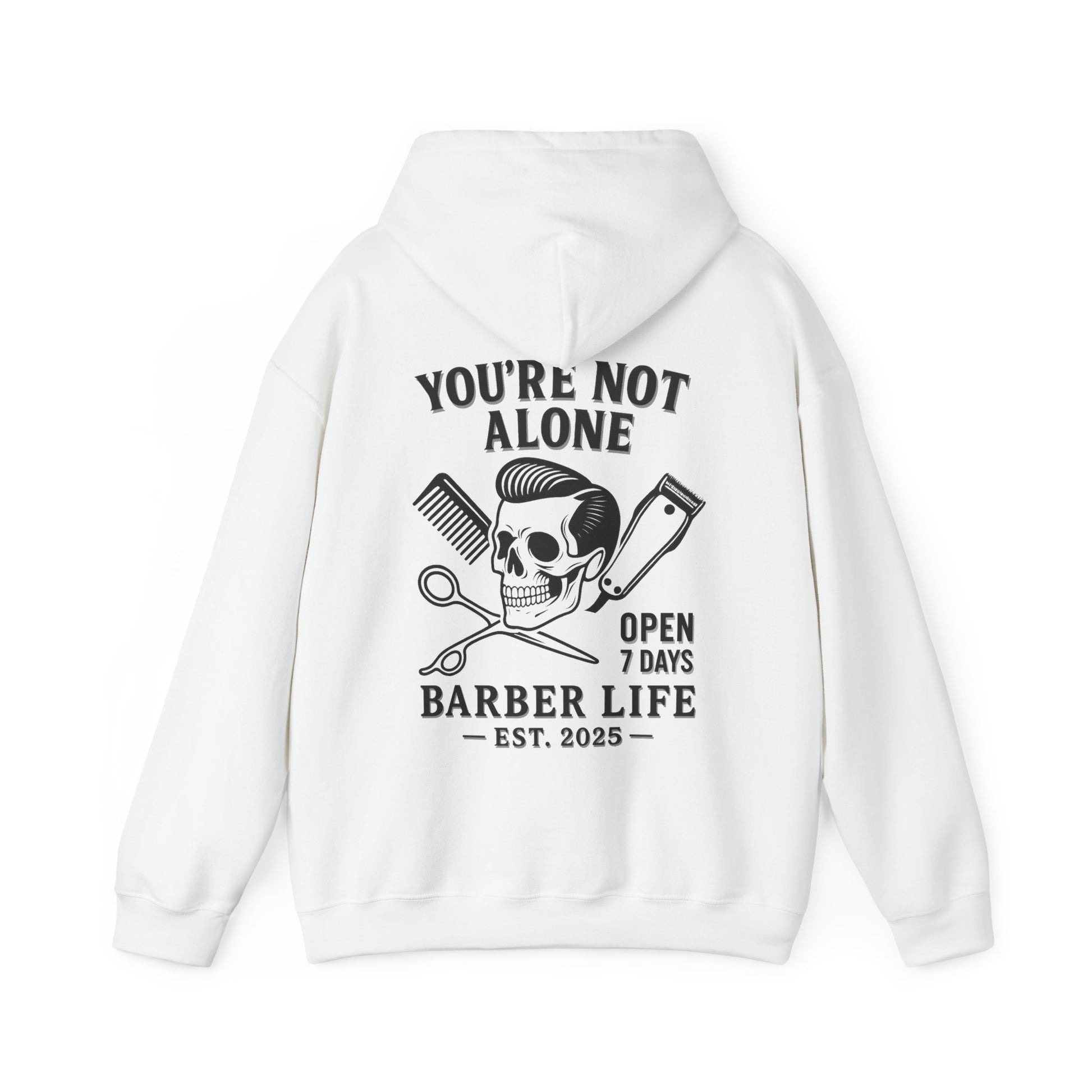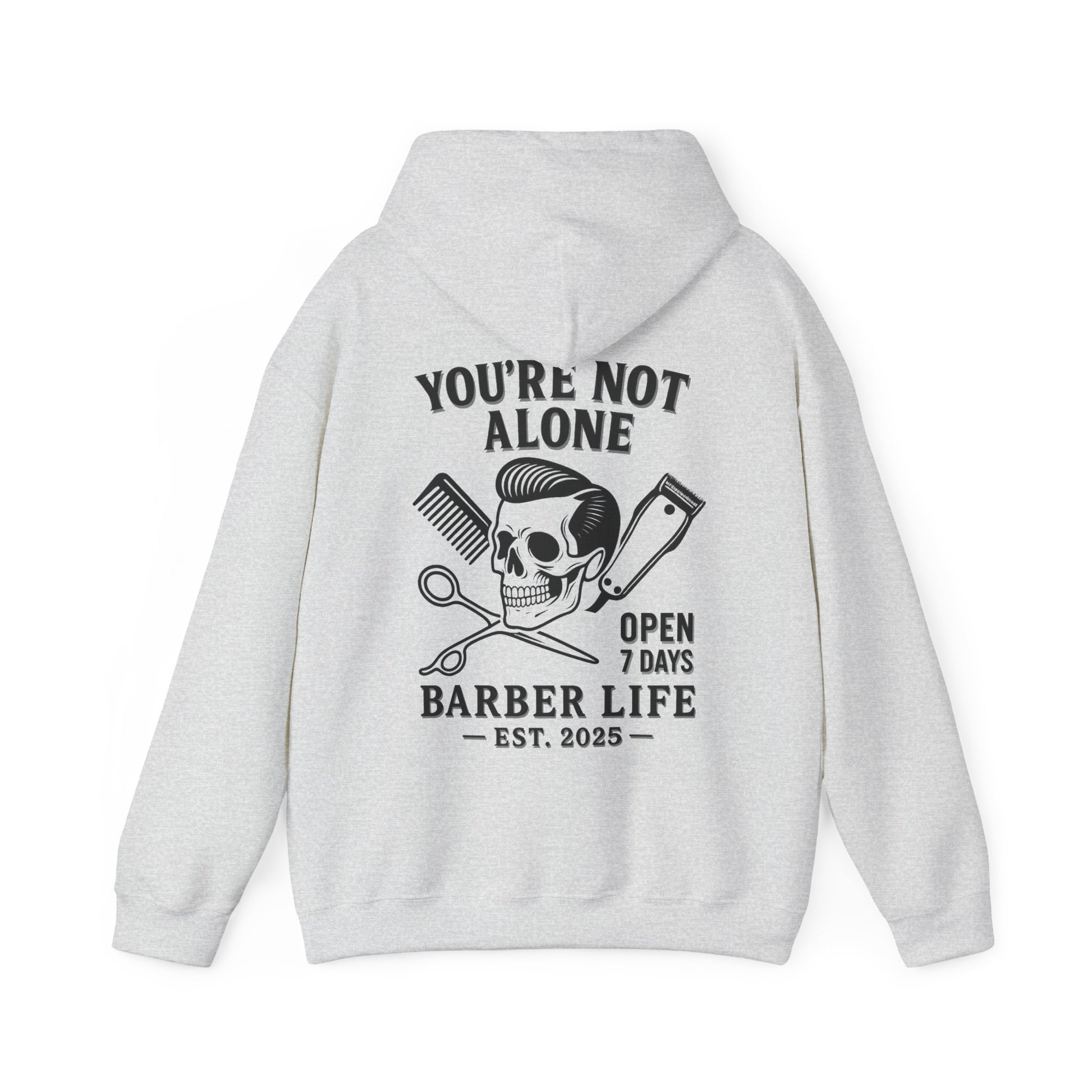 With its crisp black-and-white graphic, subtle “You’re Not Alone” message, and a bold “OPEN 7 DAYS” red tag, it’s built to stand out in the shop or the street.