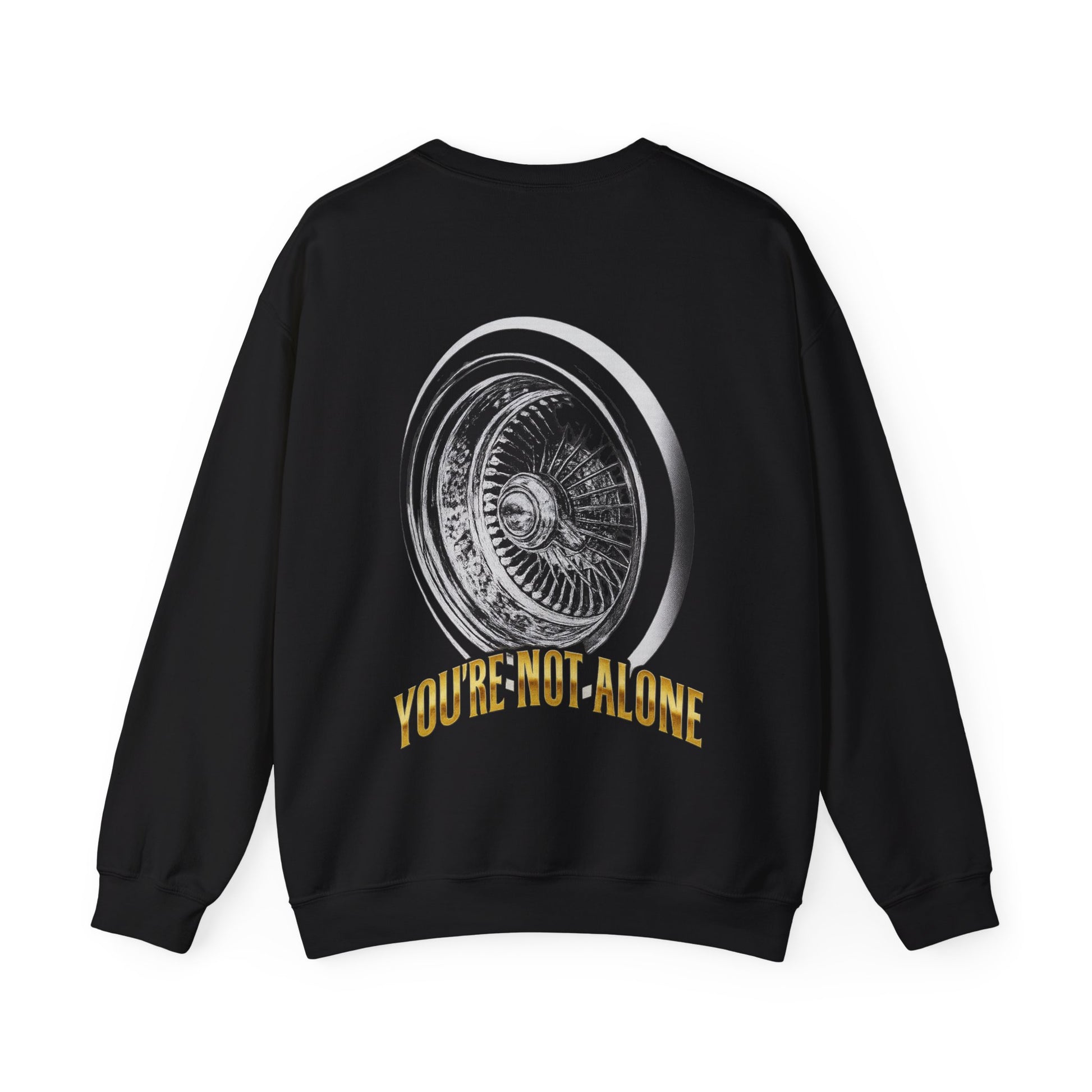 This hoodie hits like a switch. The Dayton Crewneck features a bold chrome Daytons graphic and the iconic phrase "You're Not Alone"—arched in distressed gold beneath the wheel like a lowrider crown. Perfect for the boulevard, the studio, or anywhere real ones roll.