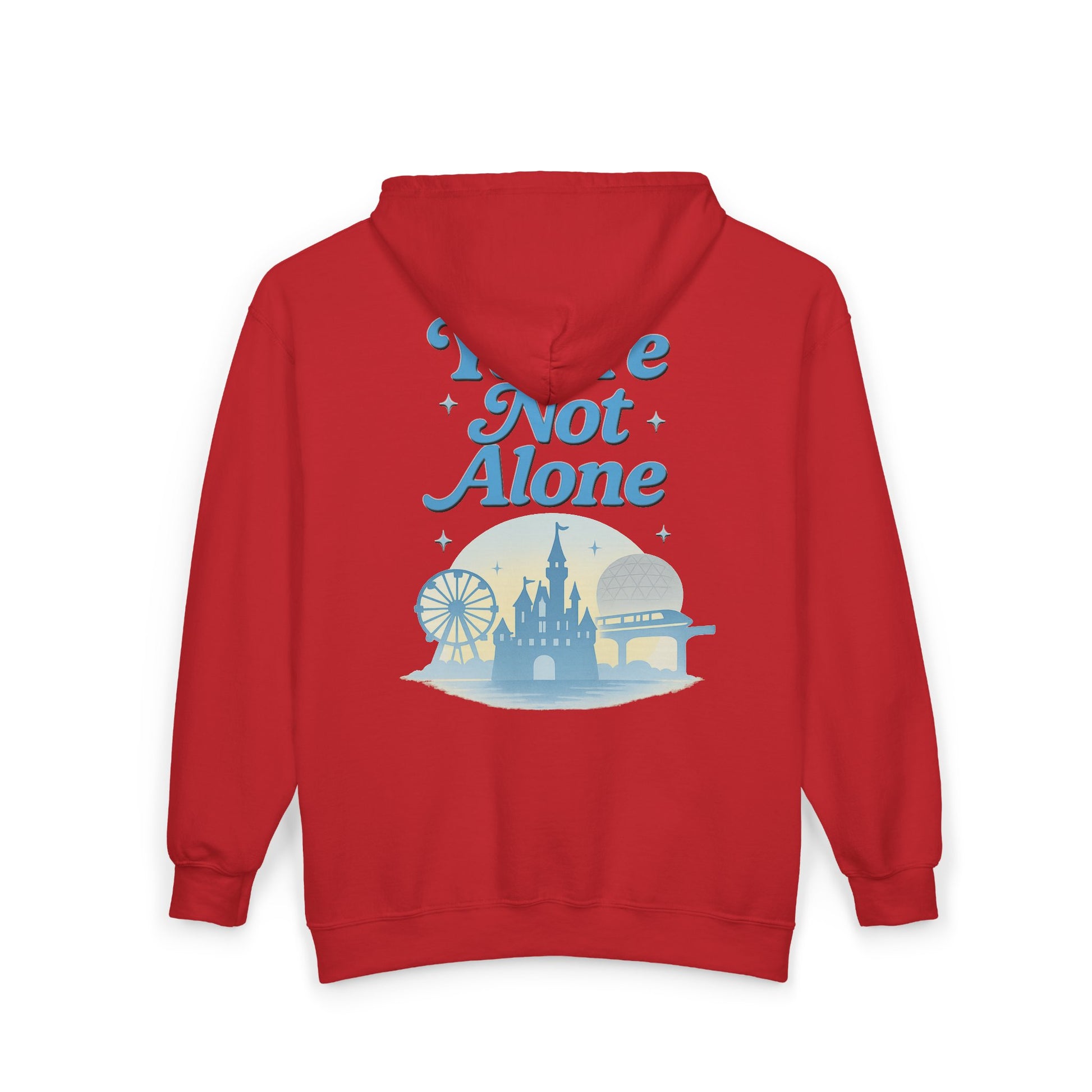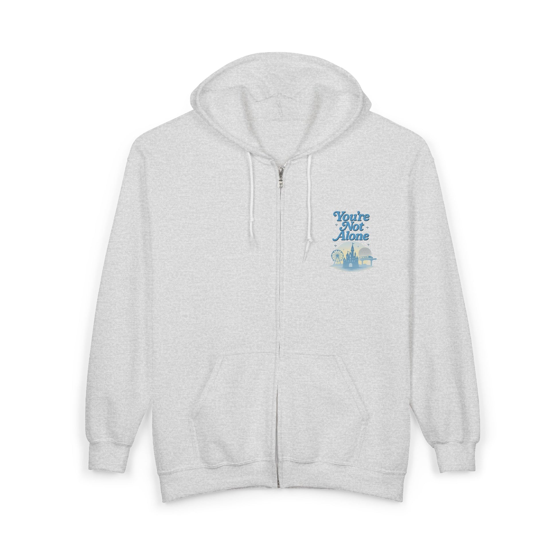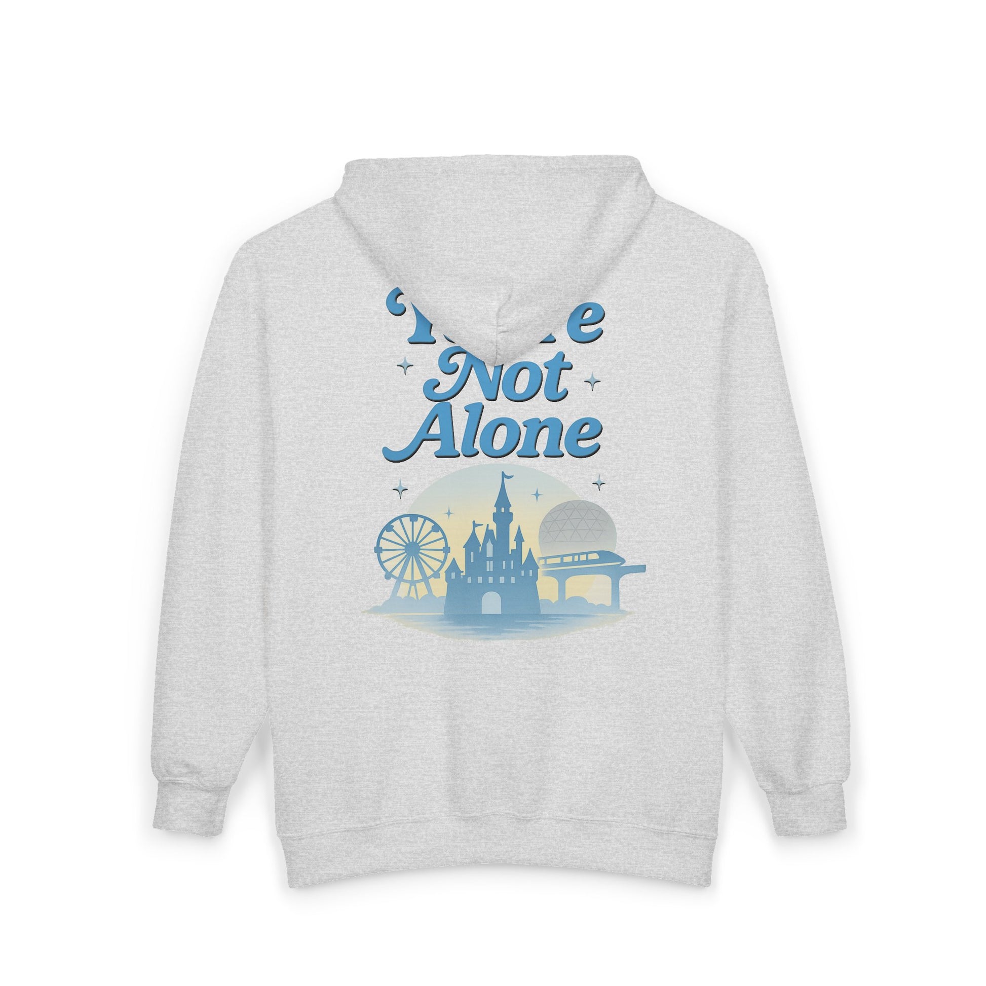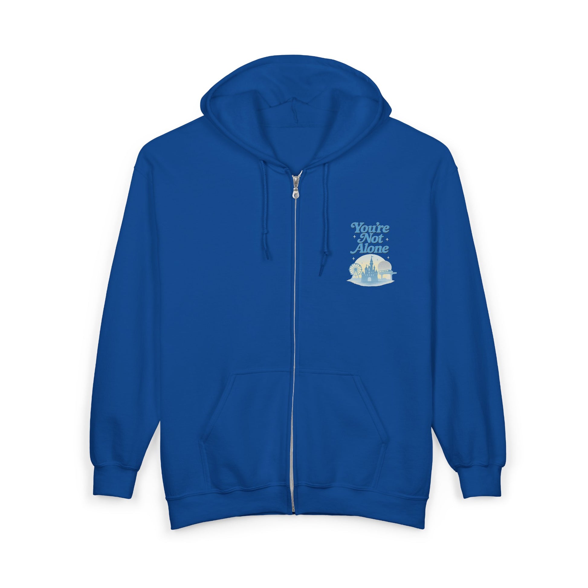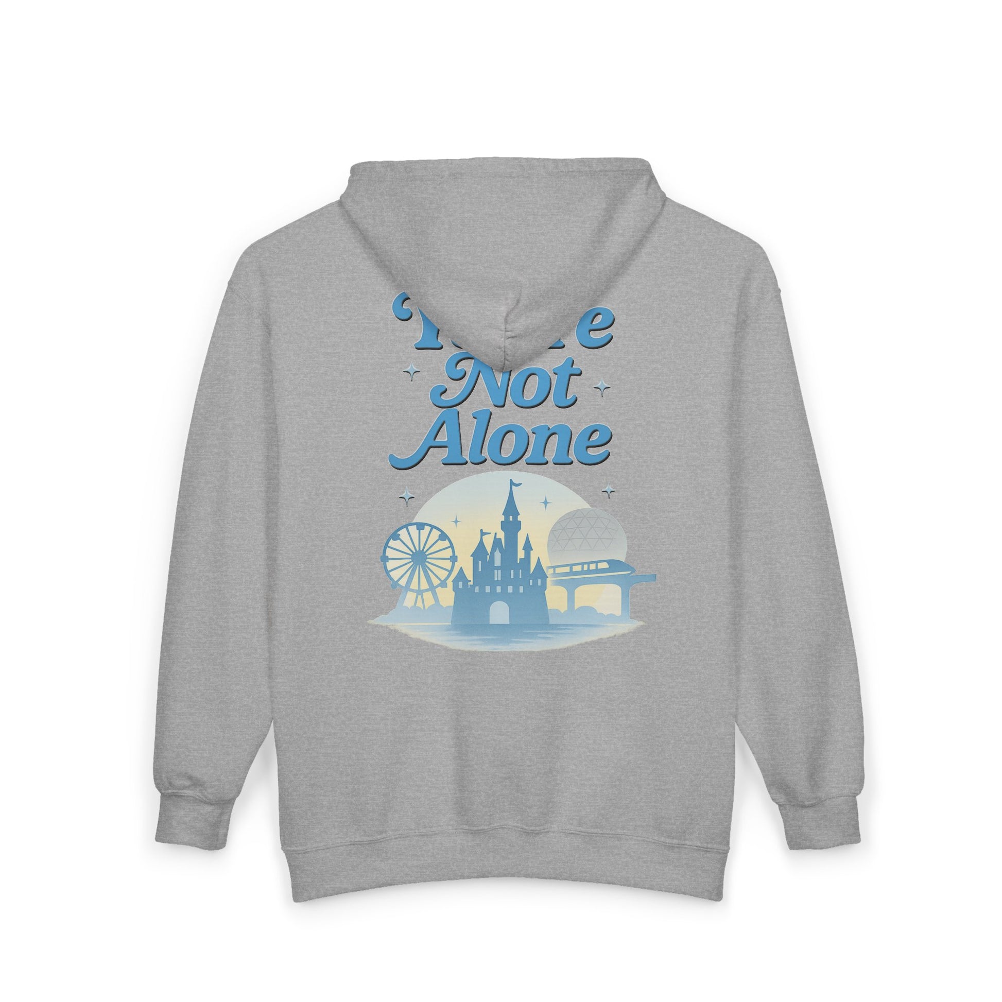 Inspired by theme park magic and childhood wonder, this hoodie features a whimsical castle, monorail, and Ferris wheel framed under starlit skies. It’s not just about a place — it’s about the feeling of hope, healing, and finding light even in the dark.