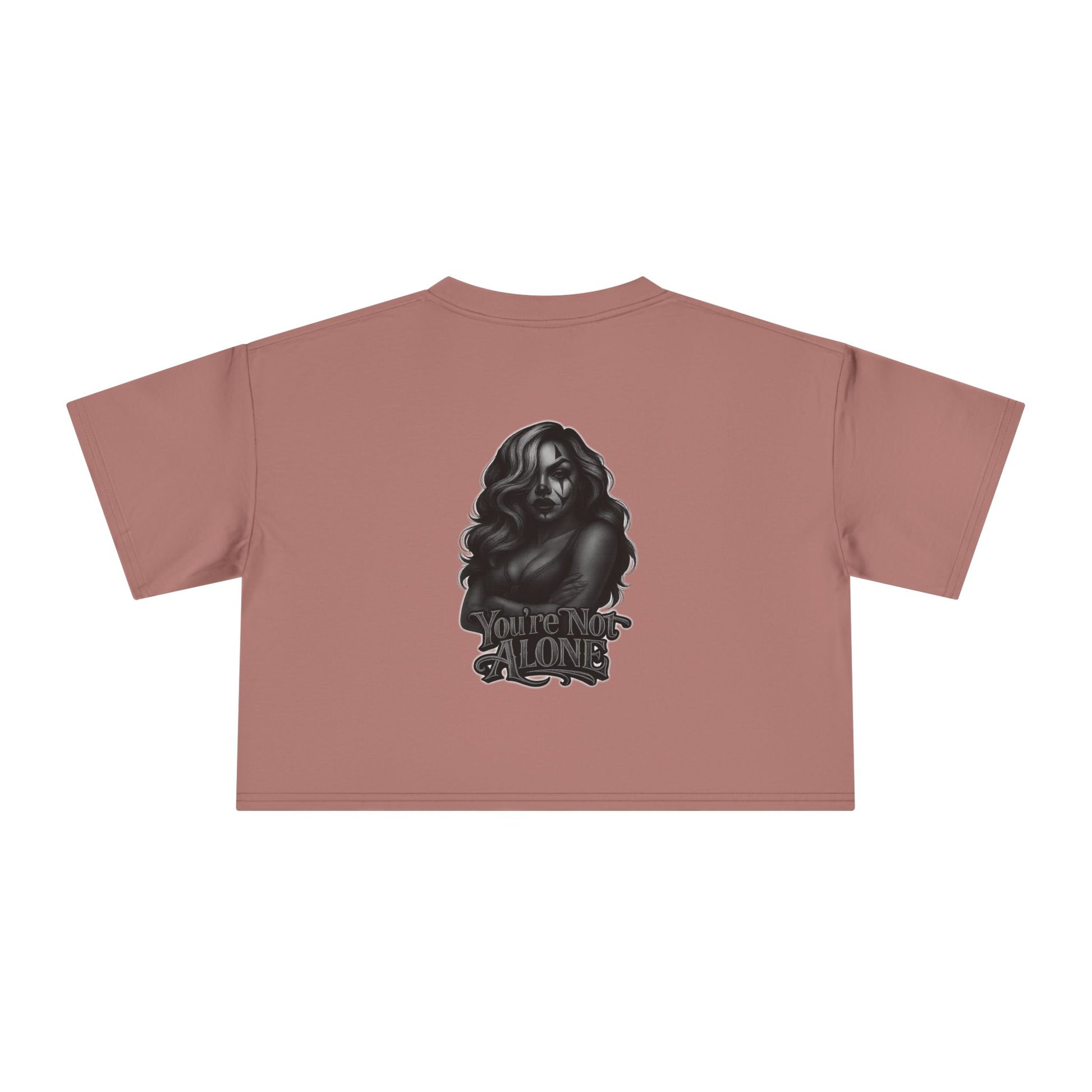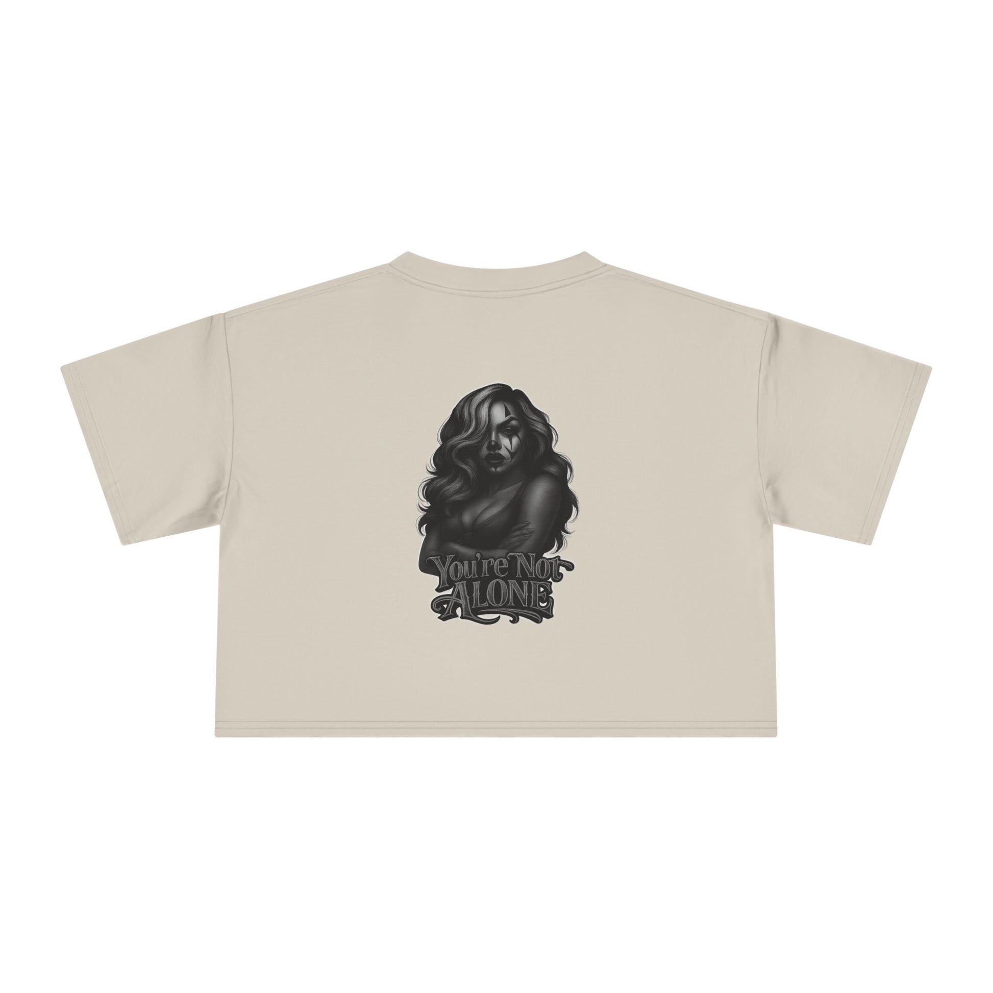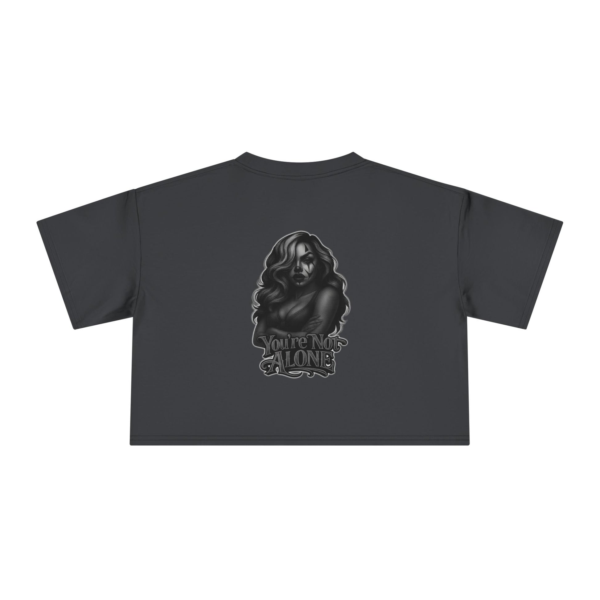 This design features a striking clown-faced woman wrapped in grayscale shadows, surrounded by the words "You're Not Alone" — a reminder of resilience through chaos, beauty in pain, and strength in silence.