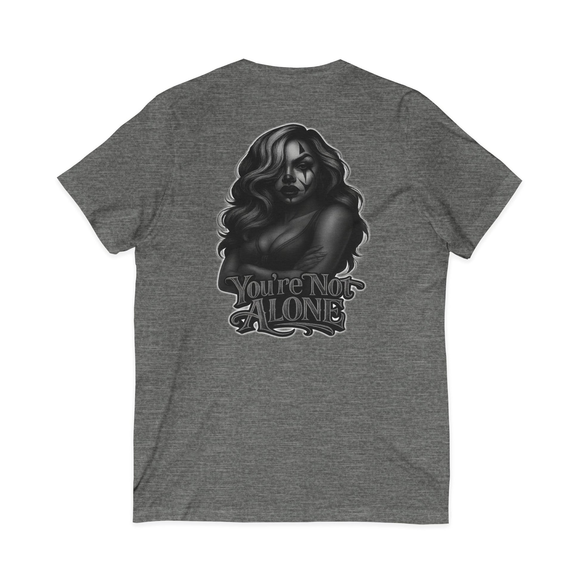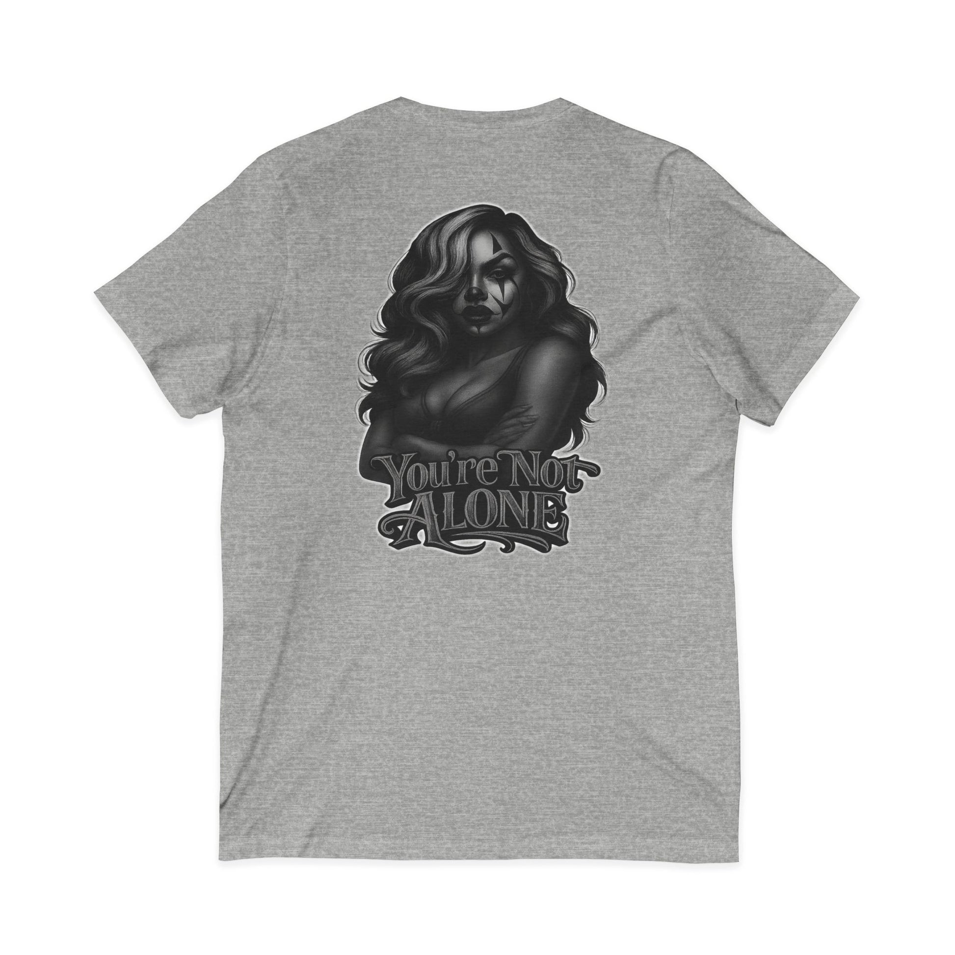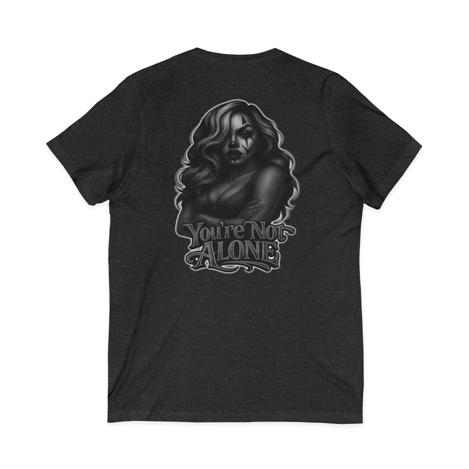 This design features a striking clown-faced woman wrapped in grayscale shadows, surrounded by the words "You're Not Alone" — a reminder of resilience through chaos, beauty in pain, and strength in silence.