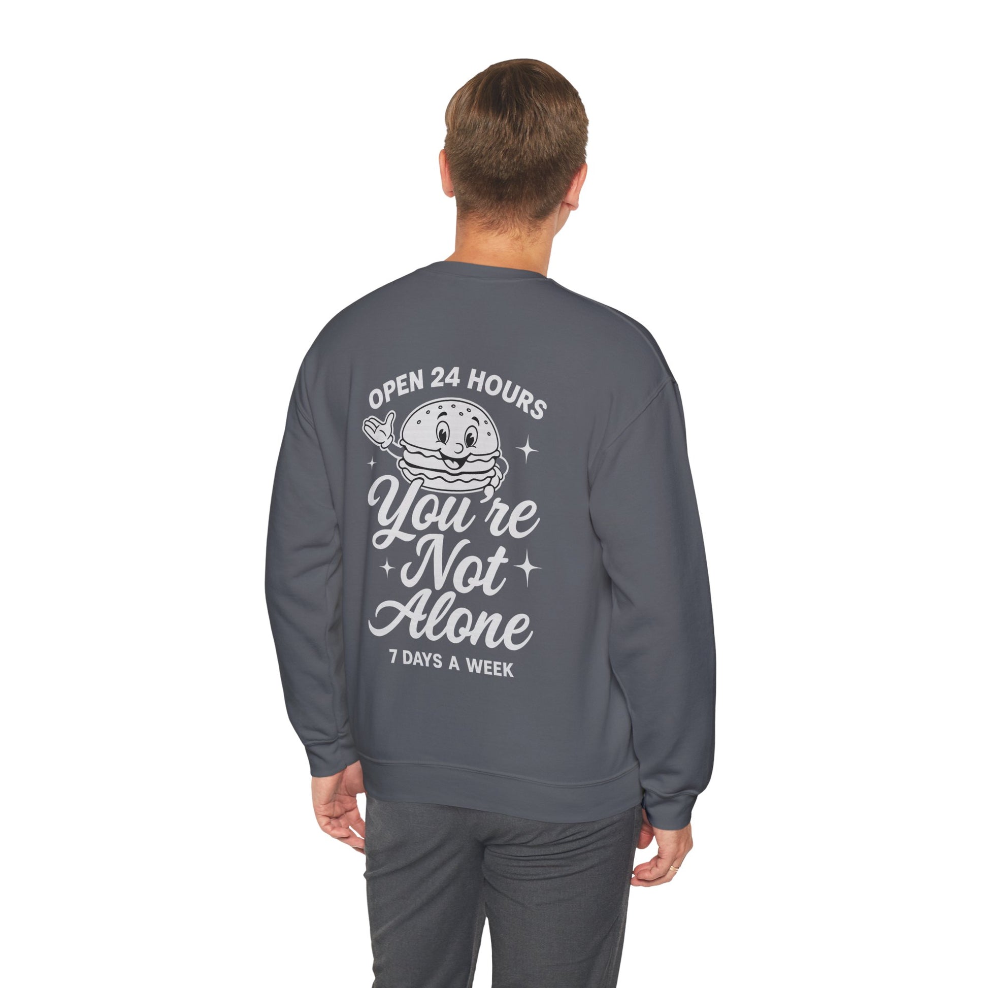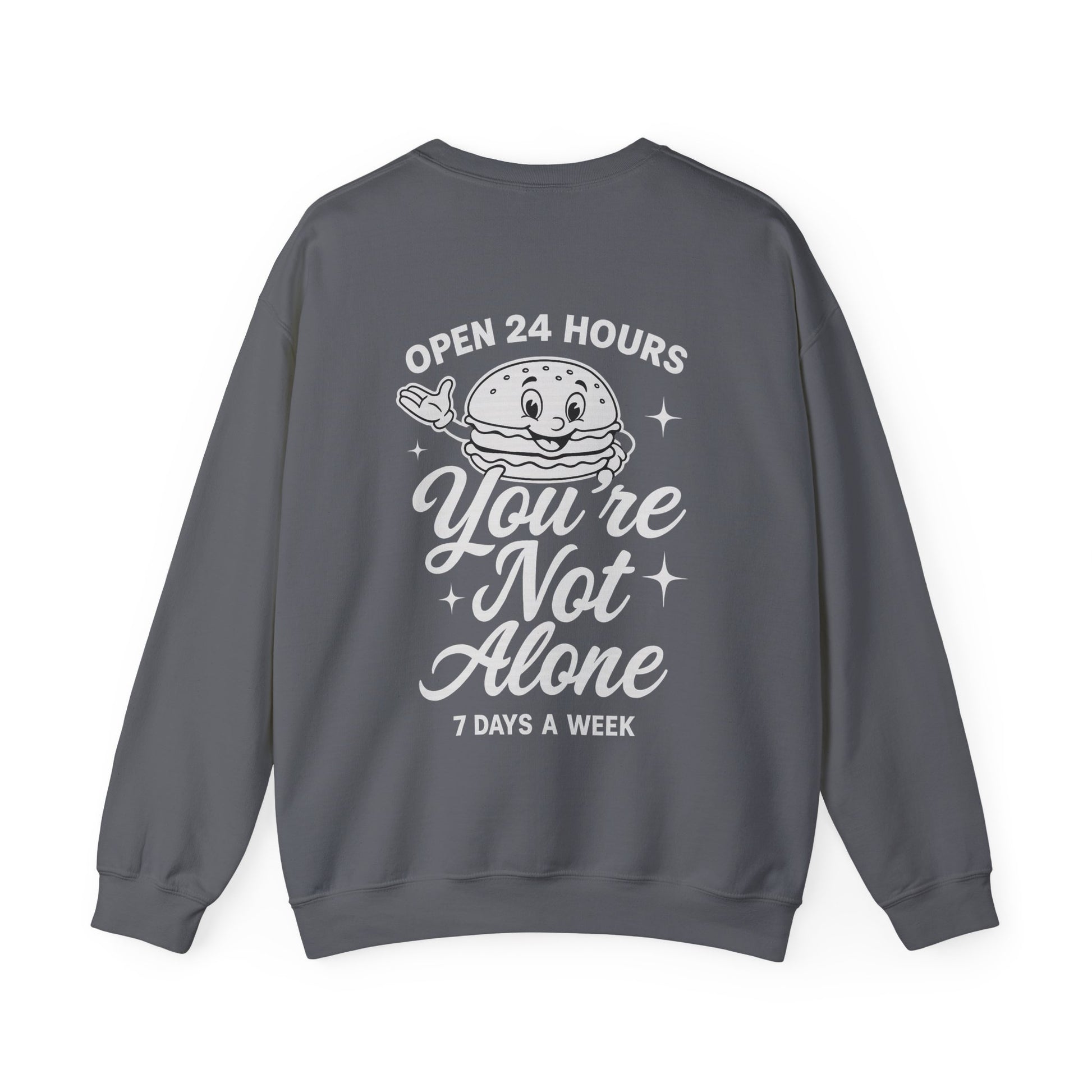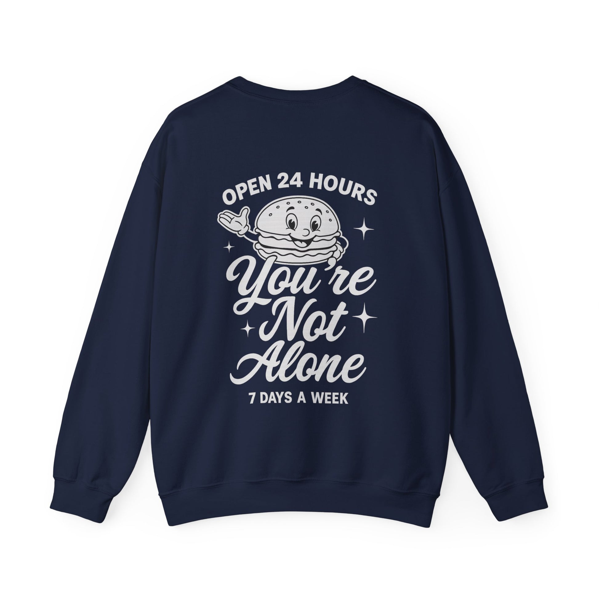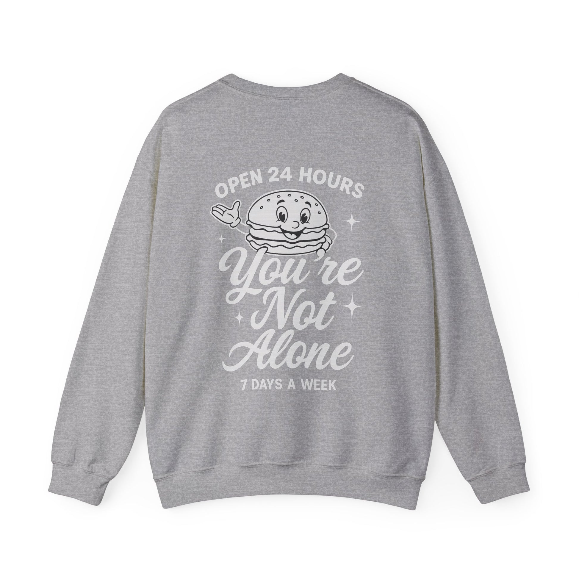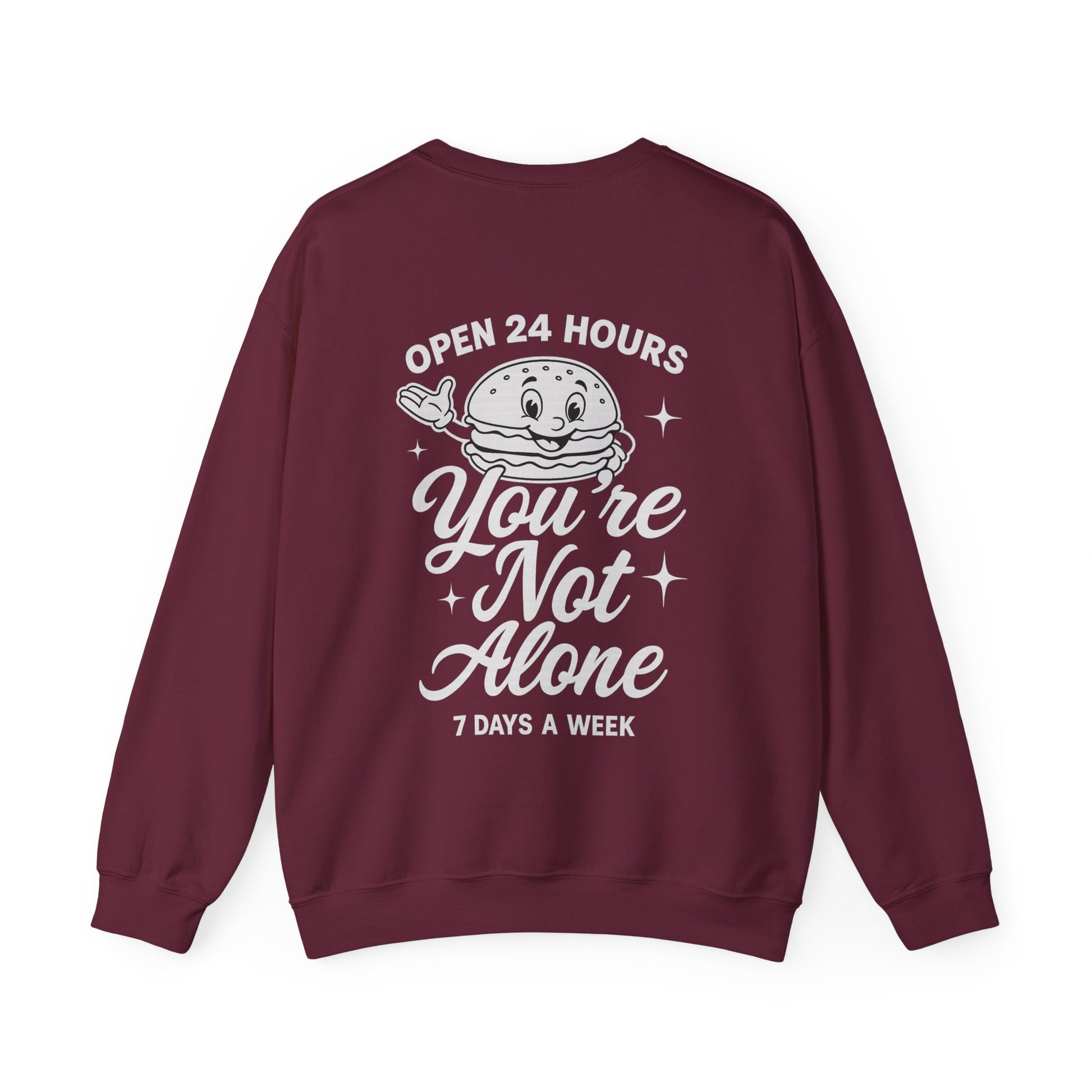 Sink into comfort with our Unisex "You're Not Alone" Crewneck Sweater — a laid-back statement piece designed to support more than just your style. Featuring a bold custom hamburger graphic with a message that hits deeper than lunch, this Hoodie was created to celebrate the release of my single "You're Not Alone" and spark real conversations around mental health.