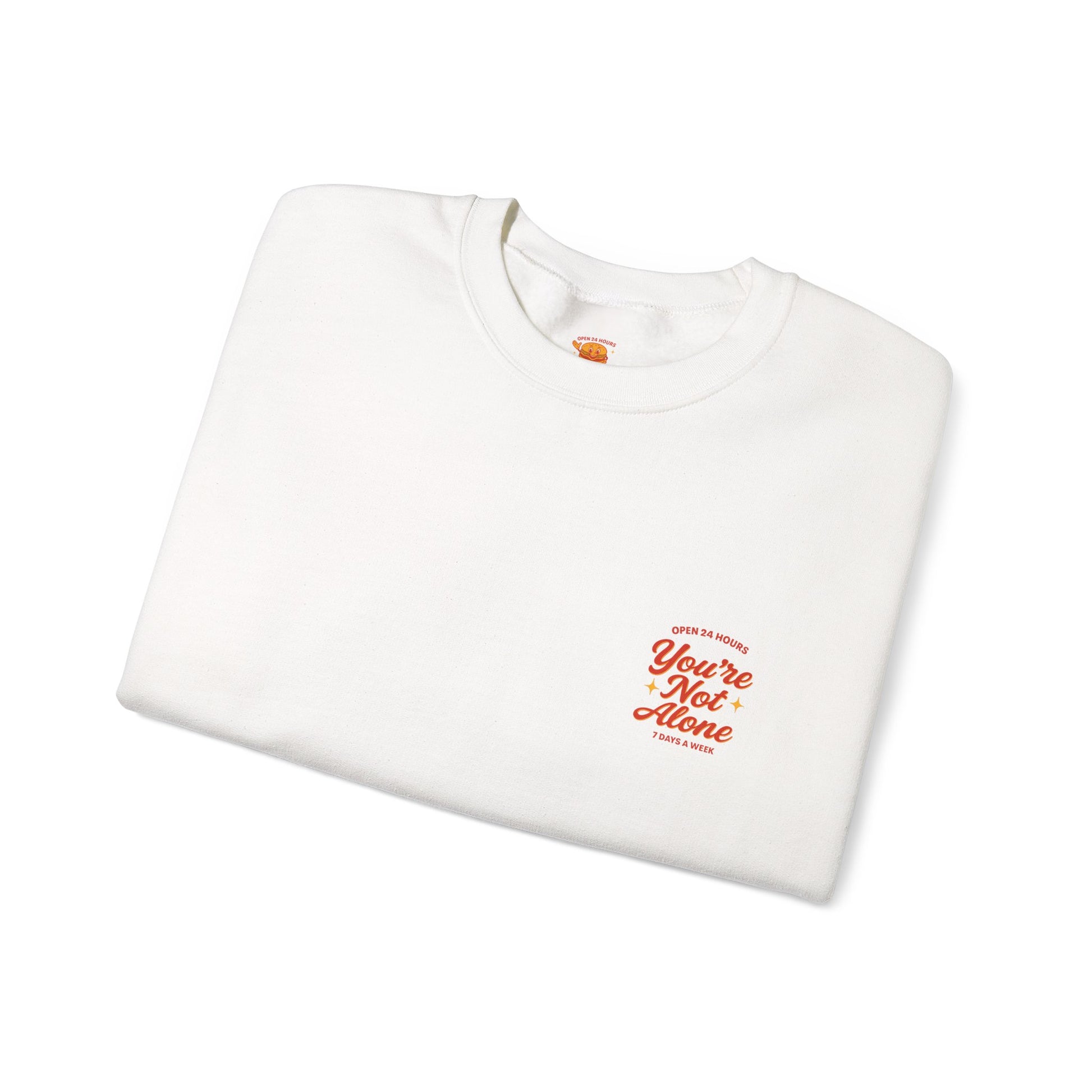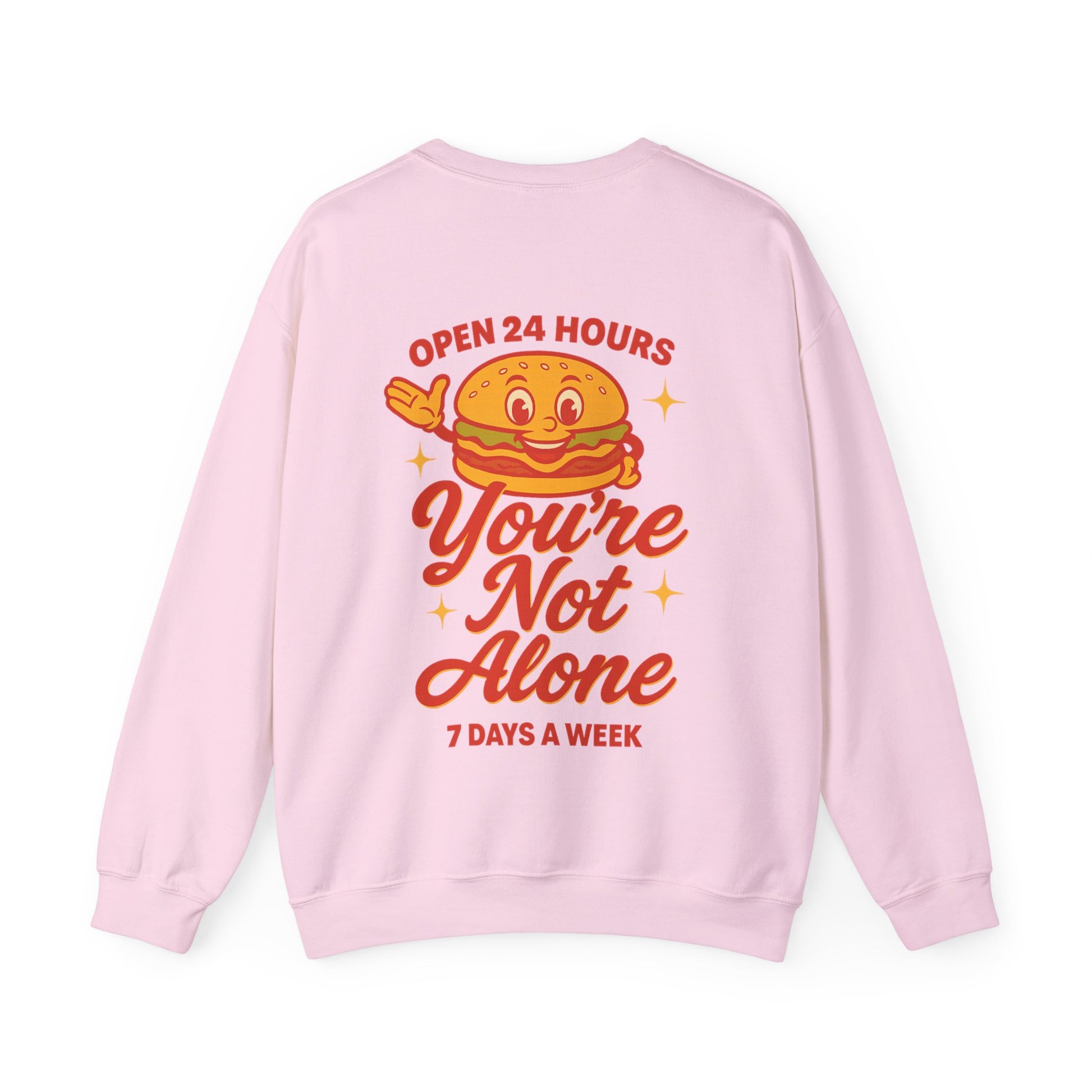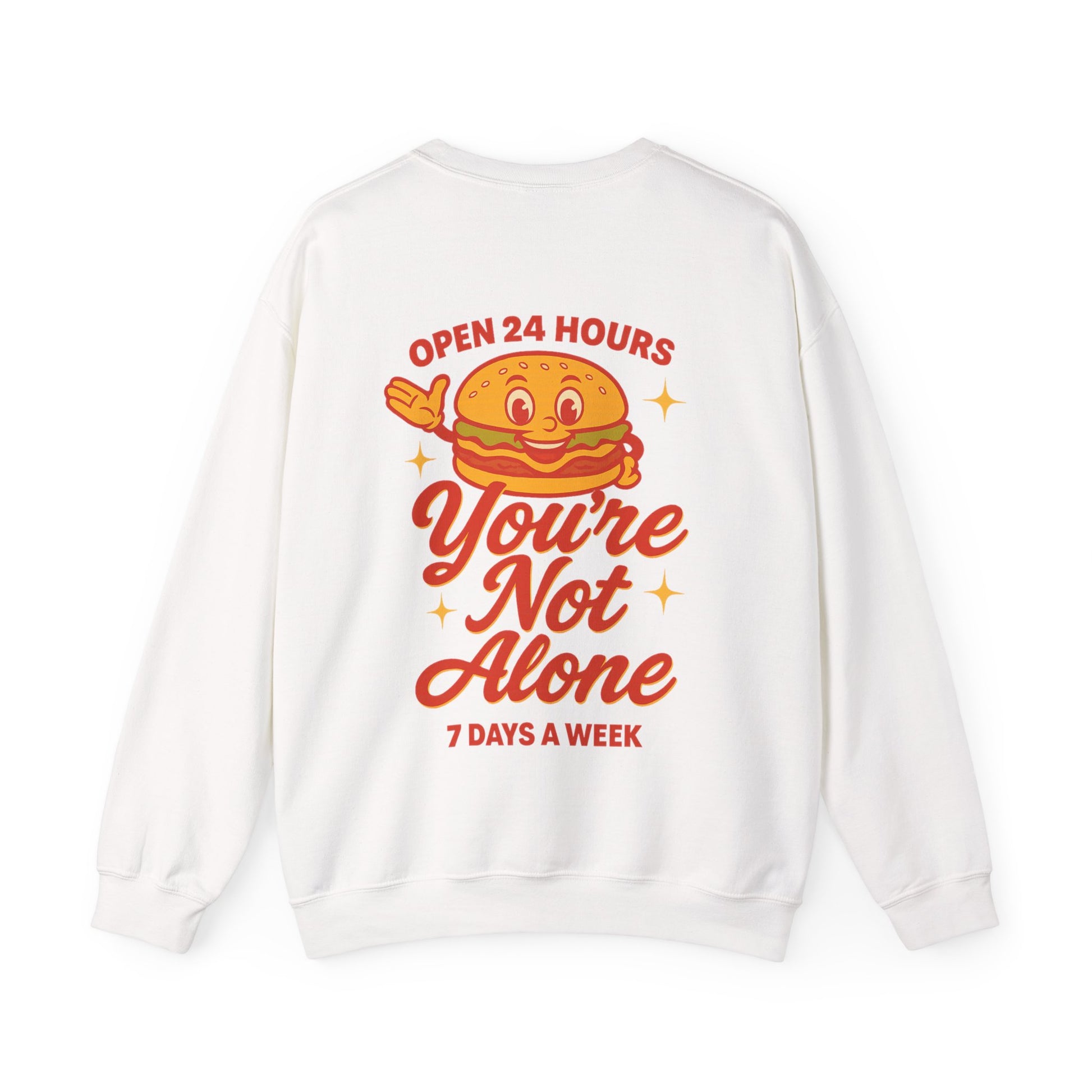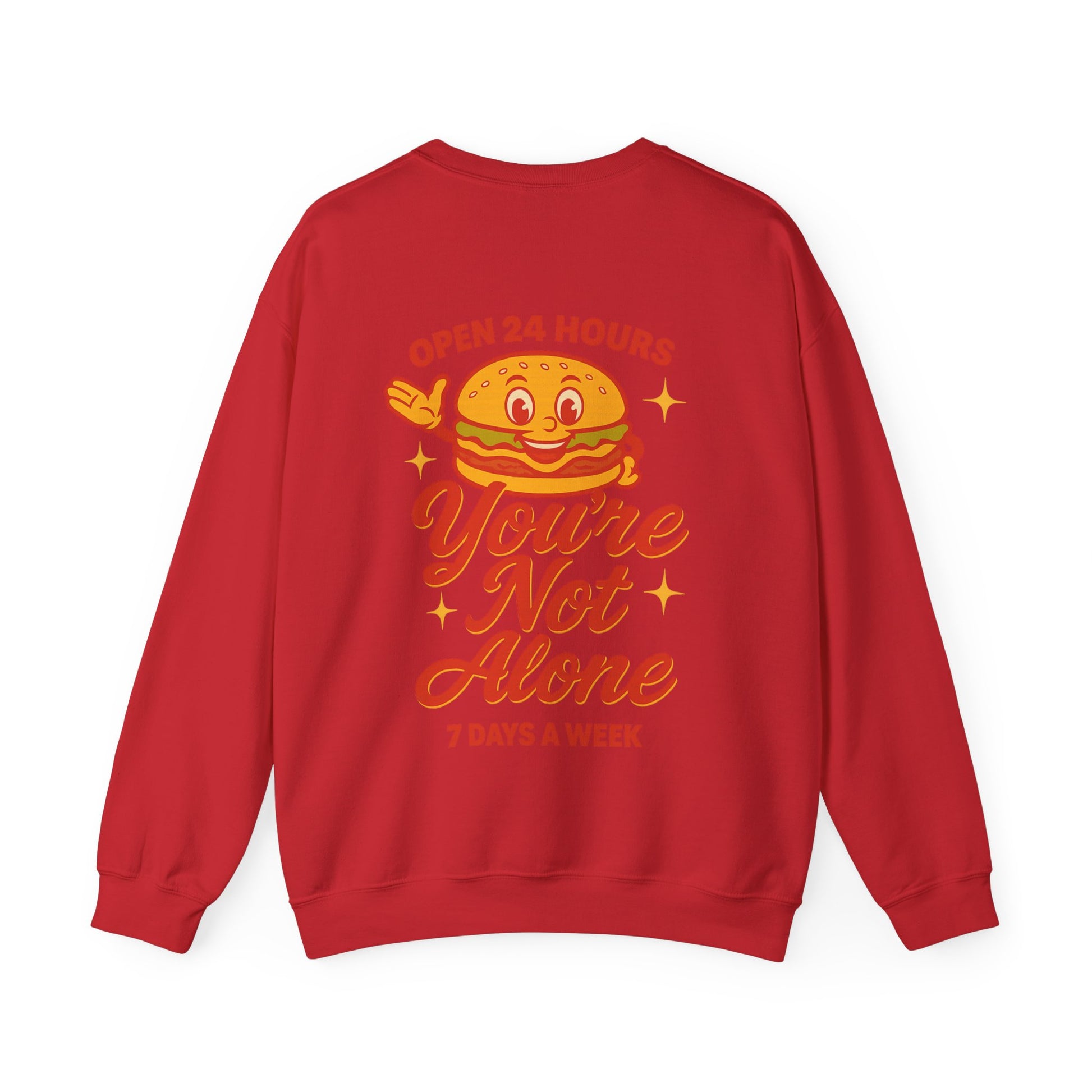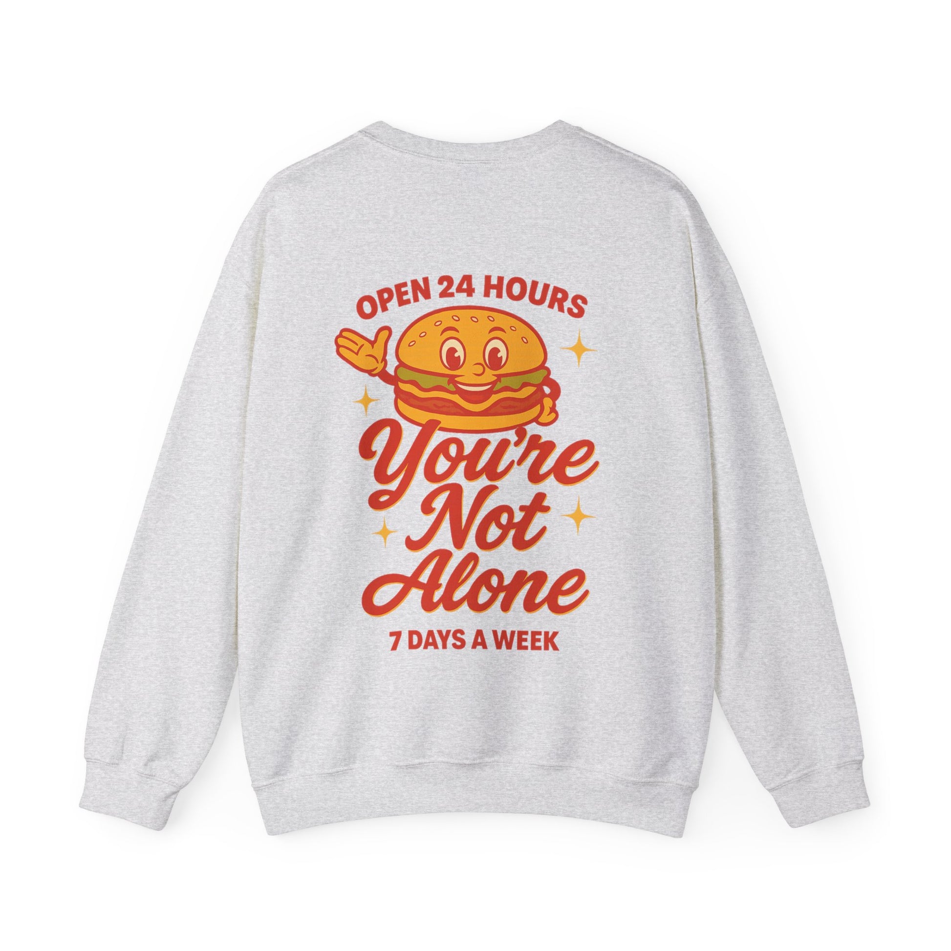 Sink into comfort with our Unisex "You're Not Alone" Crewneck Sweater — a laid-back statement piece designed to support more than just your style. Featuring a bold custom hamburger graphic with a message that hits deeper than lunch, this Hoodie was created to celebrate the release of my single "You're Not Alone" and spark real conversations around mental health.