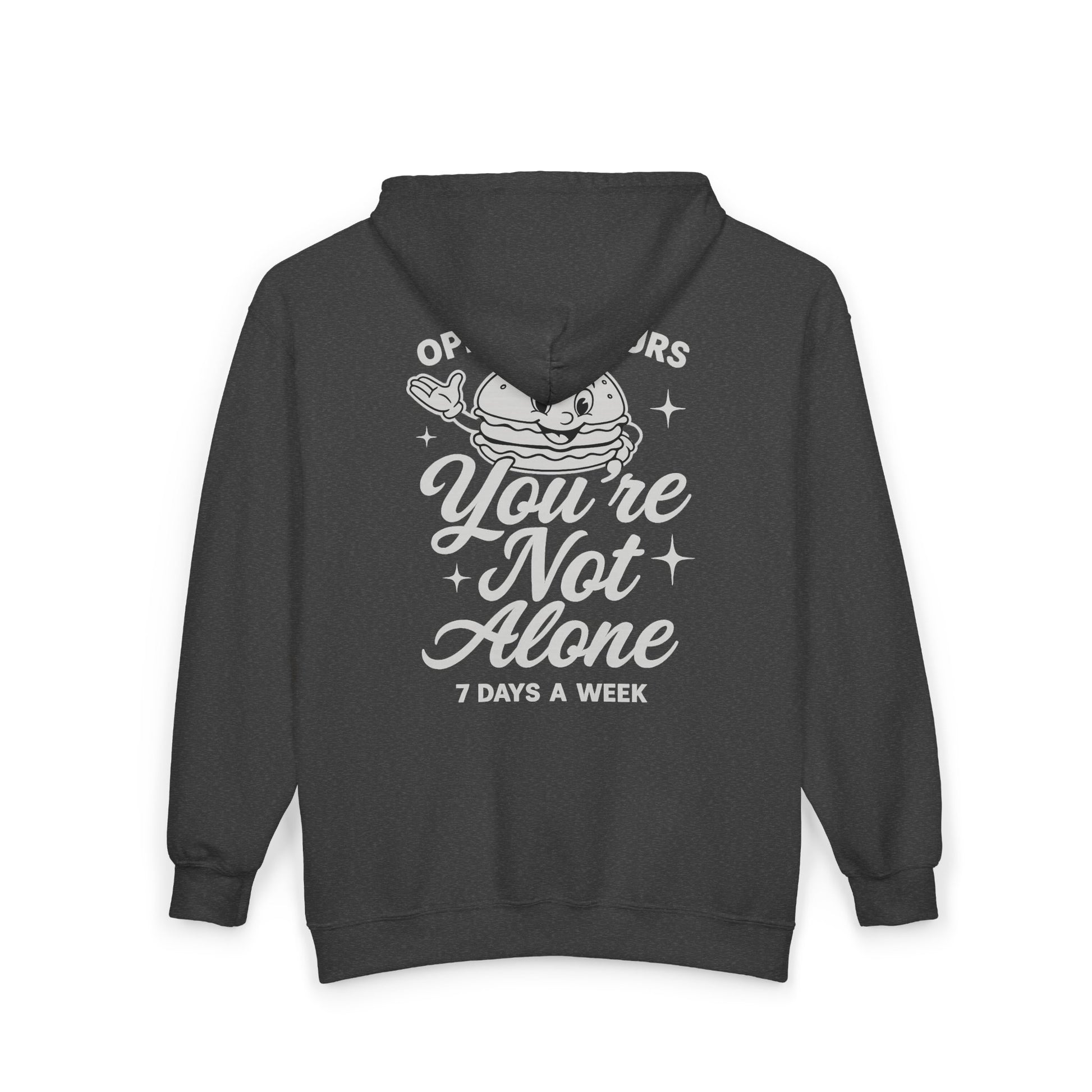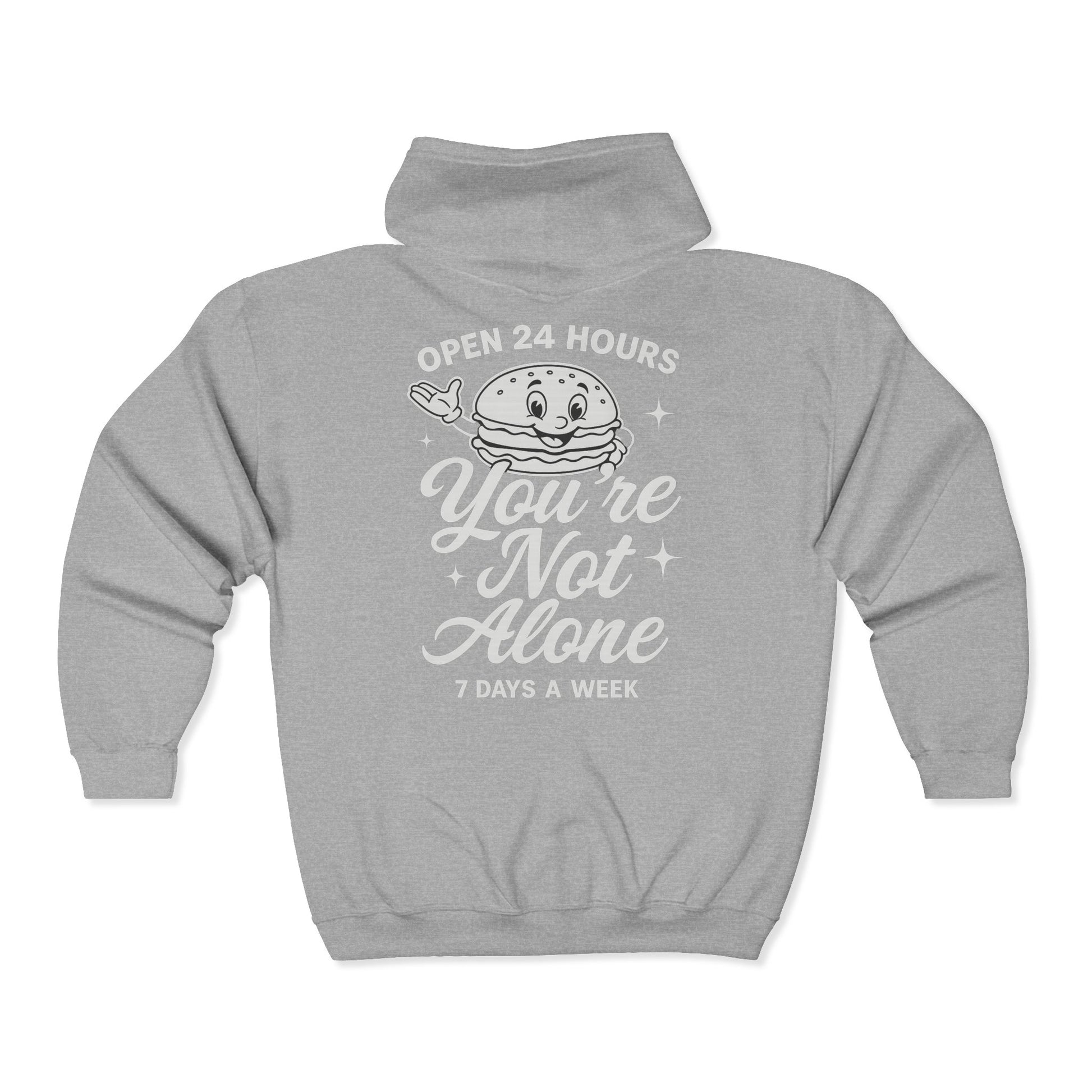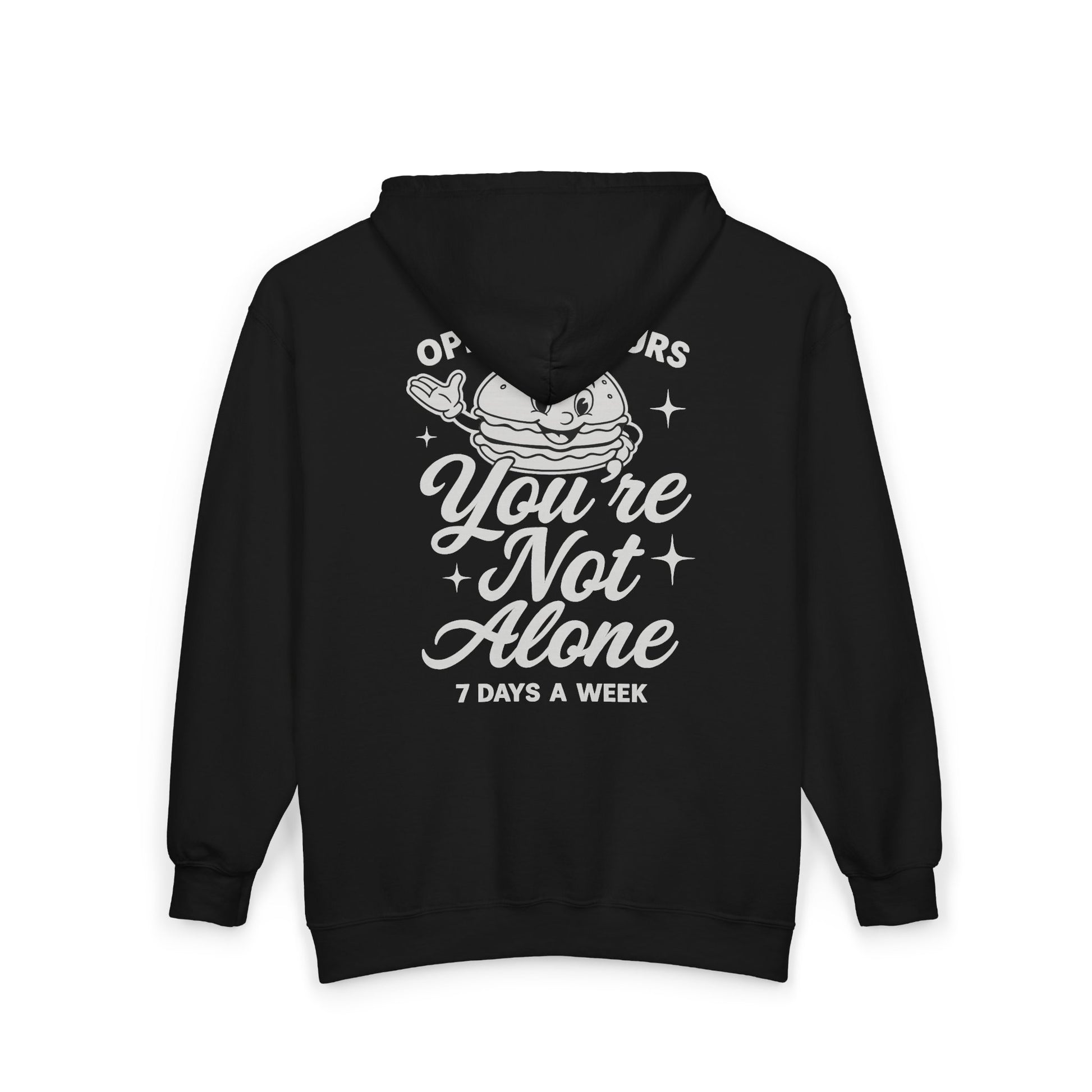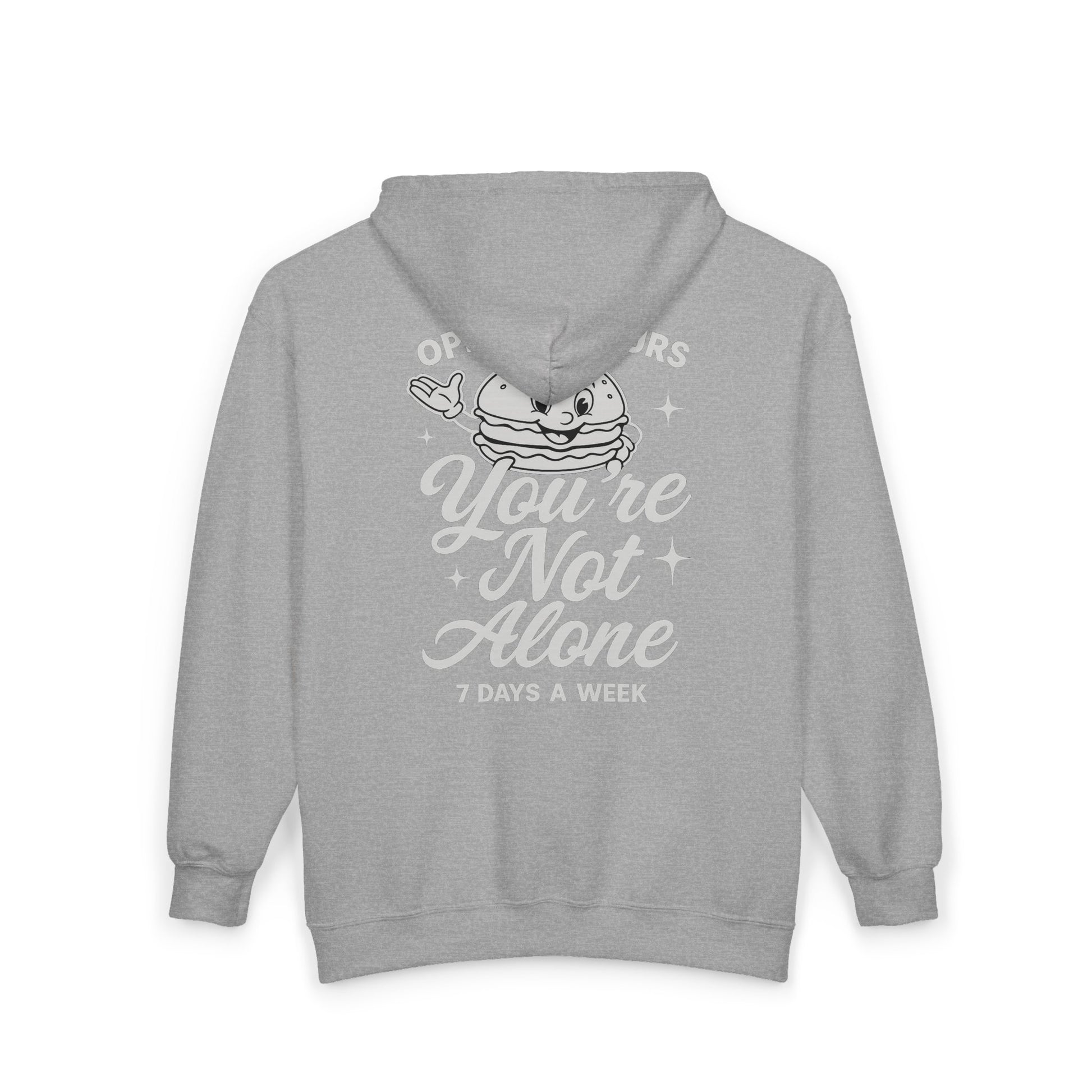 Sink into comfort with our Unisex "You're Not Alone" Zip Up Hoodie — a laid-back statement piece designed to support more than just your style. Featuring a bold custom hamburger graphic with a message that hits deeper than lunch, this Hoodie was created to celebrate the release of my single "You're Not Alone" and spark real conversations around mental health.