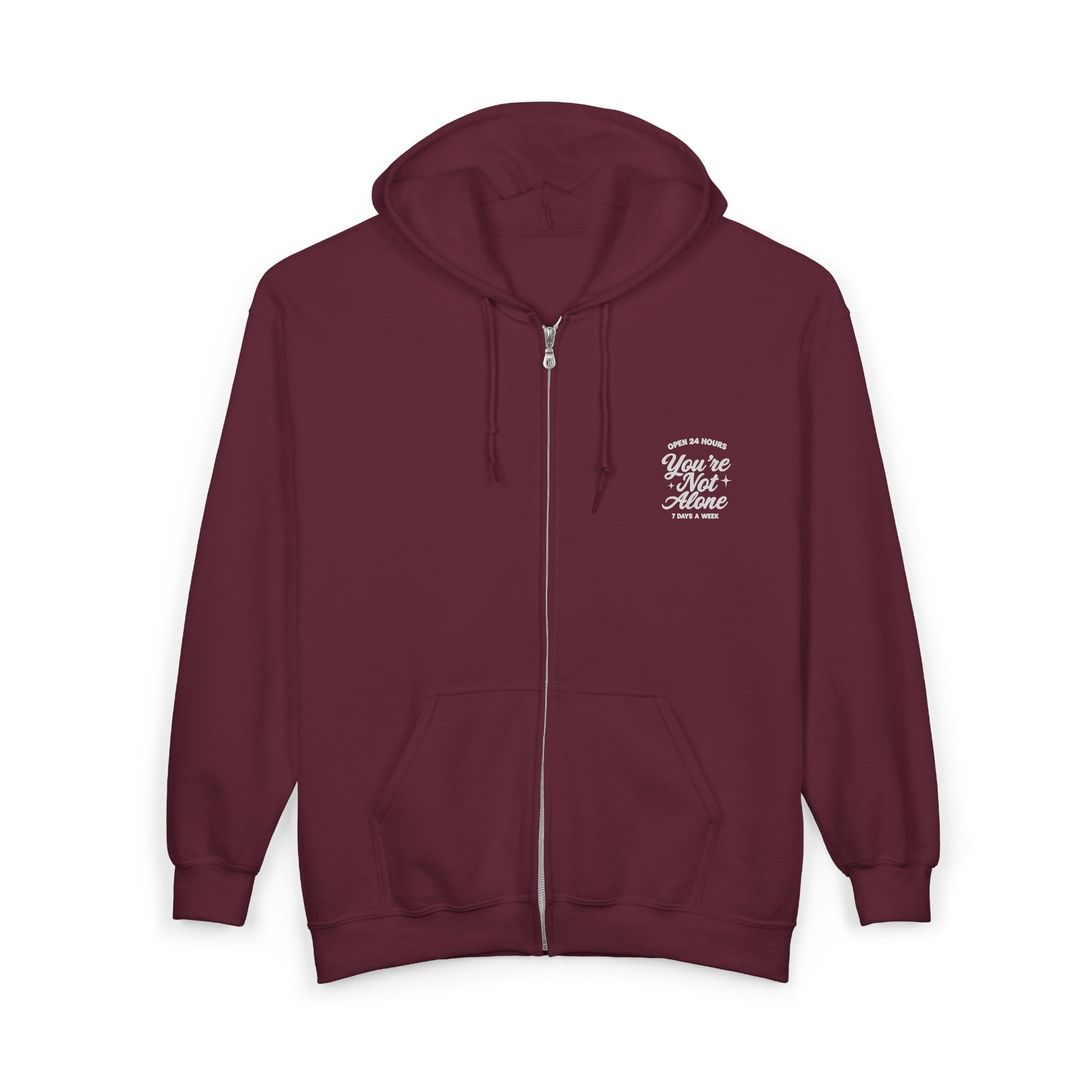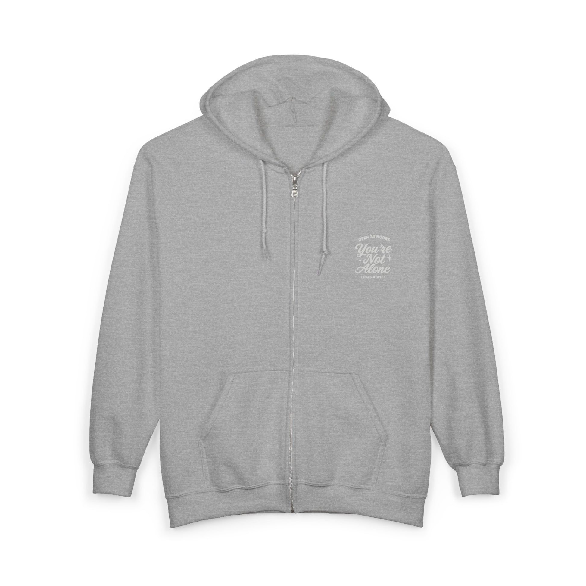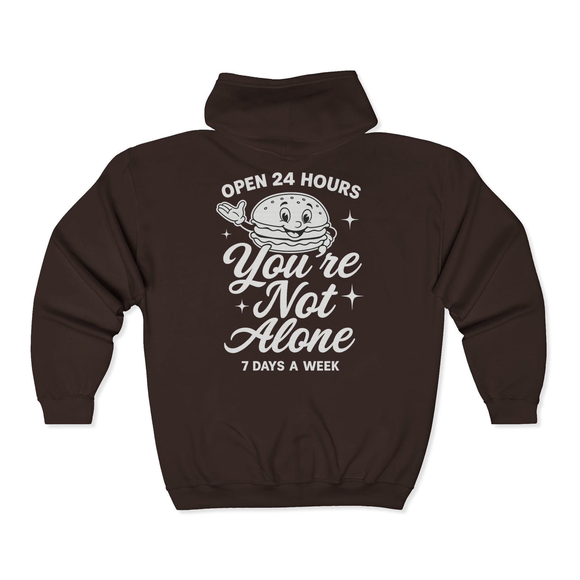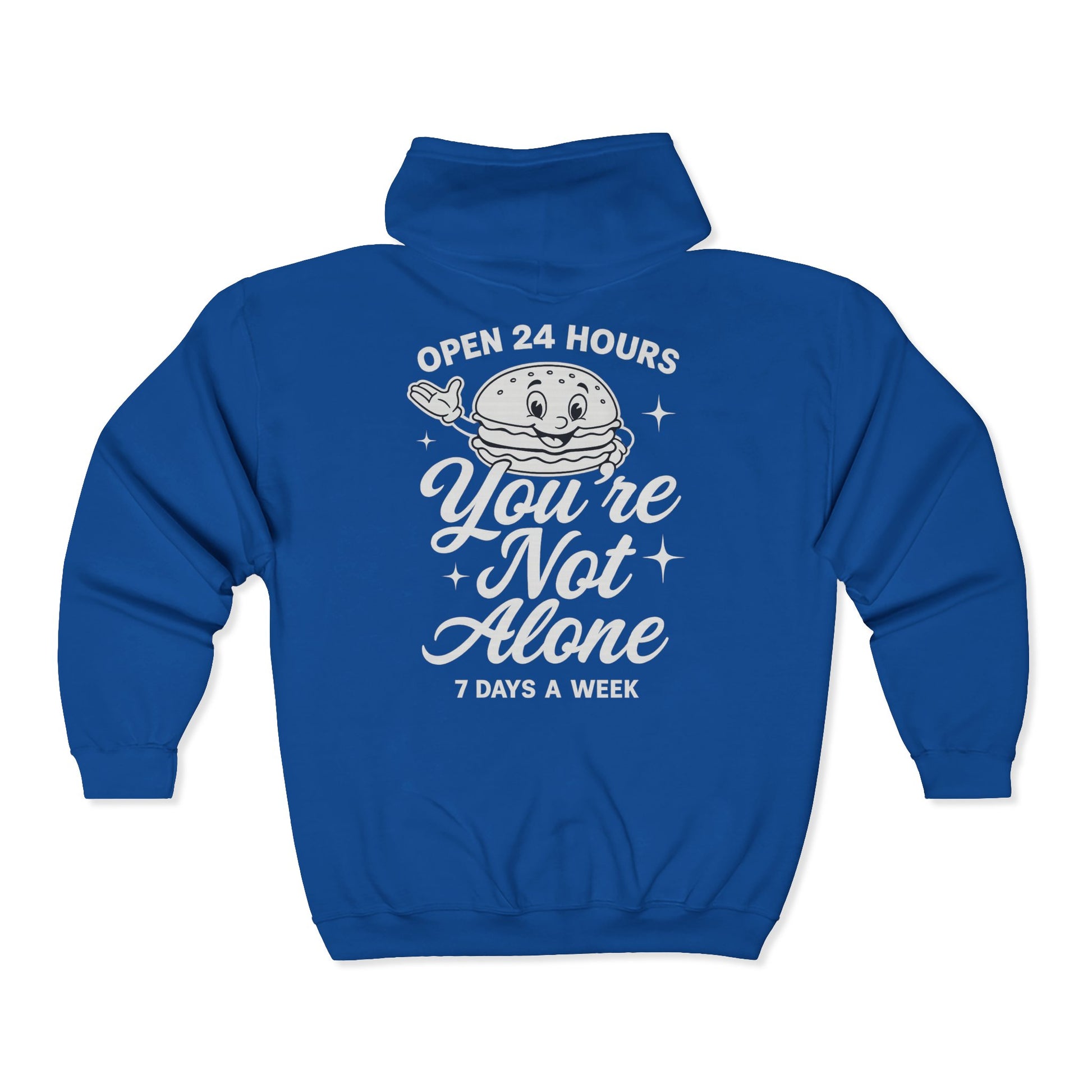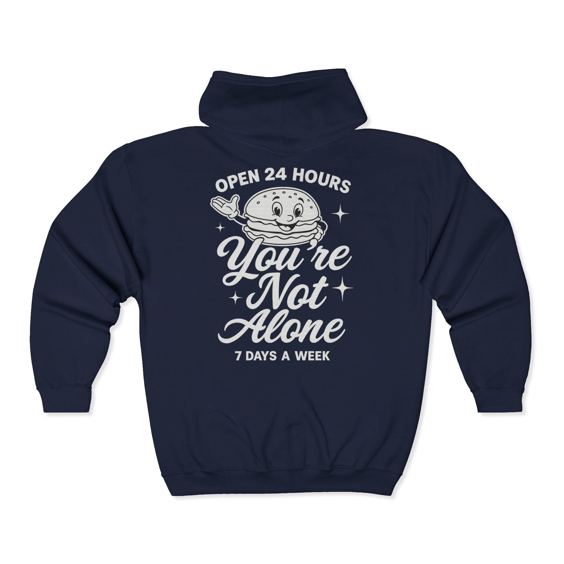 Sink into comfort with our Unisex "You're Not Alone" Zip Up Hoodie — a laid-back statement piece designed to support more than just your style. Featuring a bold custom hamburger graphic with a message that hits deeper than lunch, this Hoodie was created to celebrate the release of my single "You're Not Alone" and spark real conversations around mental health.
