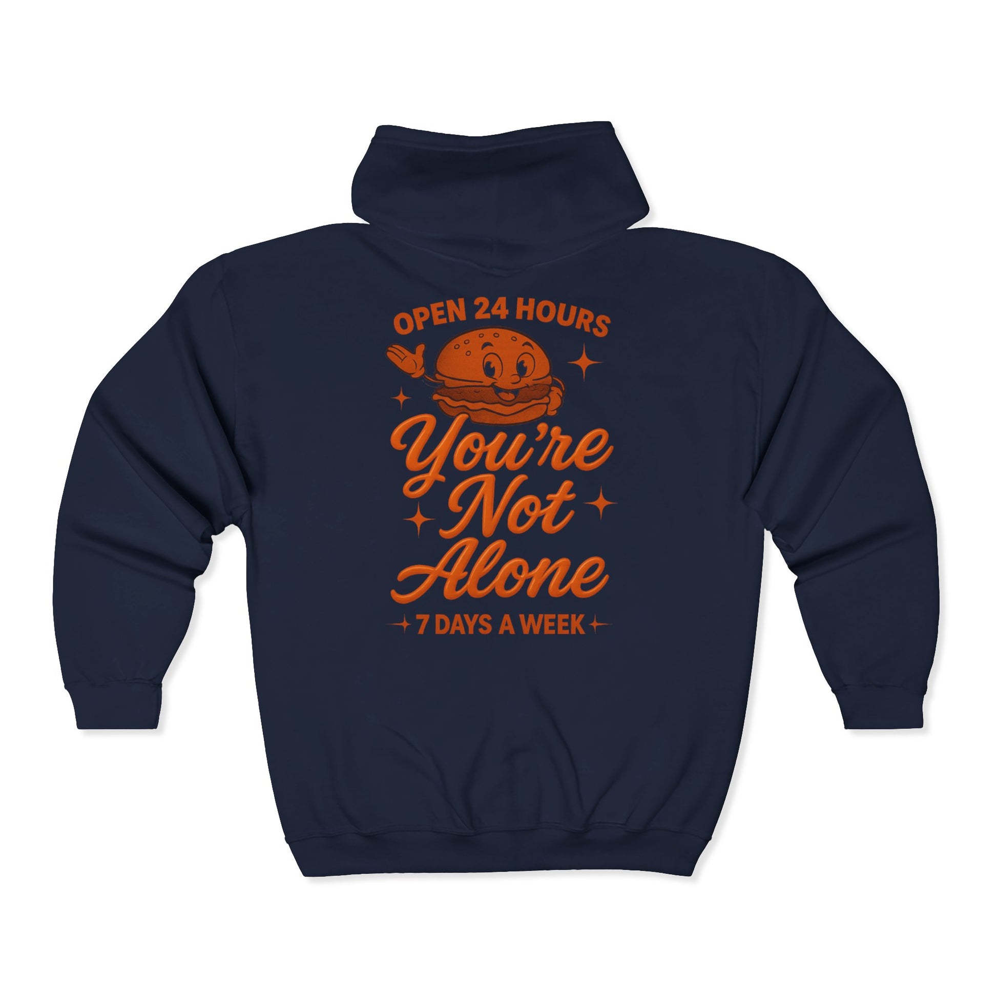 Sink into comfort with our Unisex "You're Not Alone" Zip Up Hoodie — a laid-back statement piece designed to support more than just your style. Featuring a bold custom hamburger graphic with a message that hits deeper than lunch, this Hoodie was created to celebrate the release of my single "You're Not Alone" and spark real conversations around mental health.