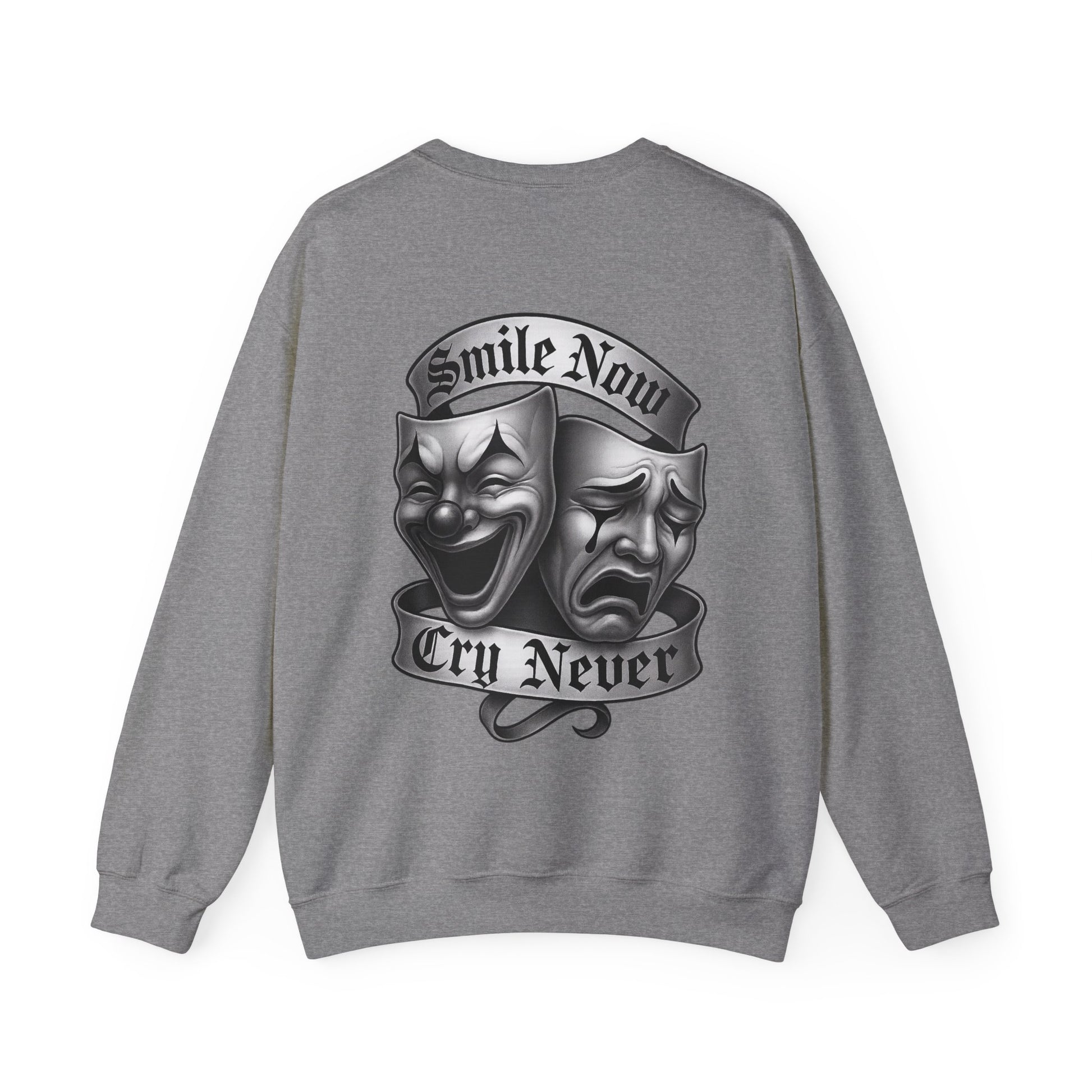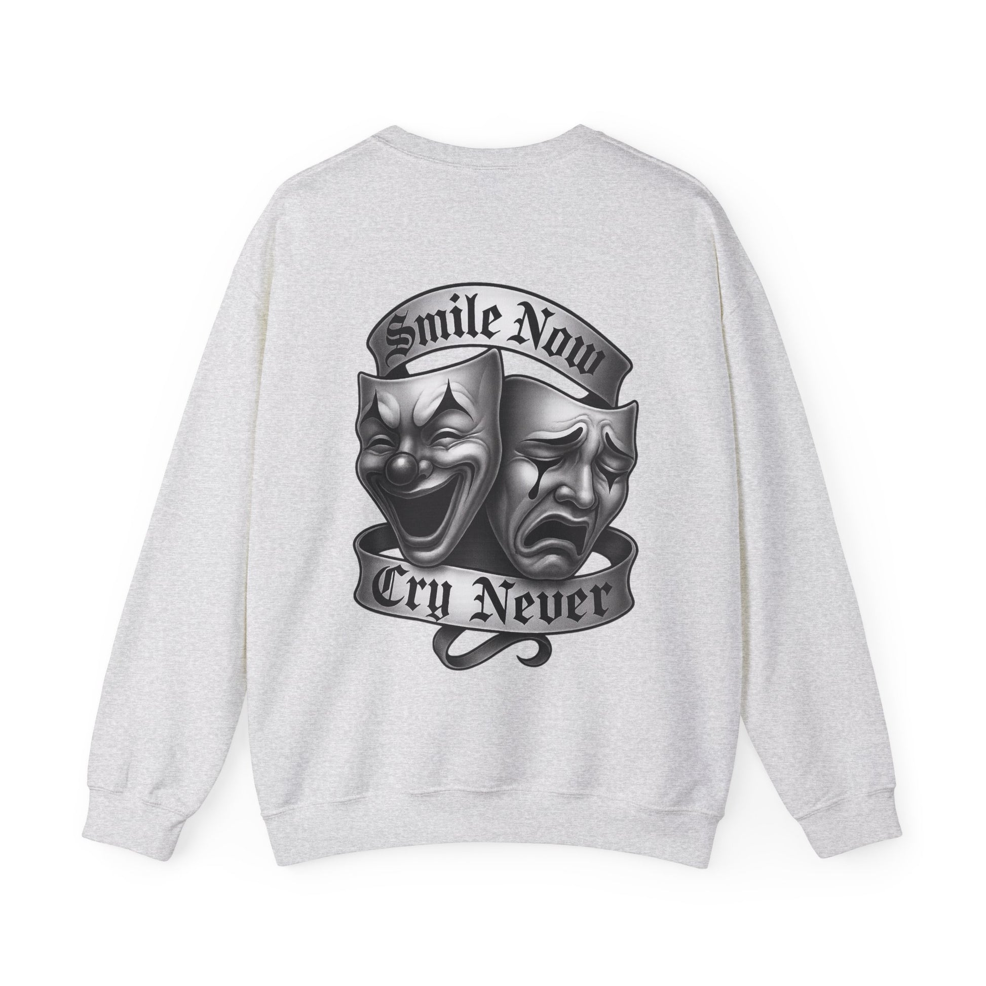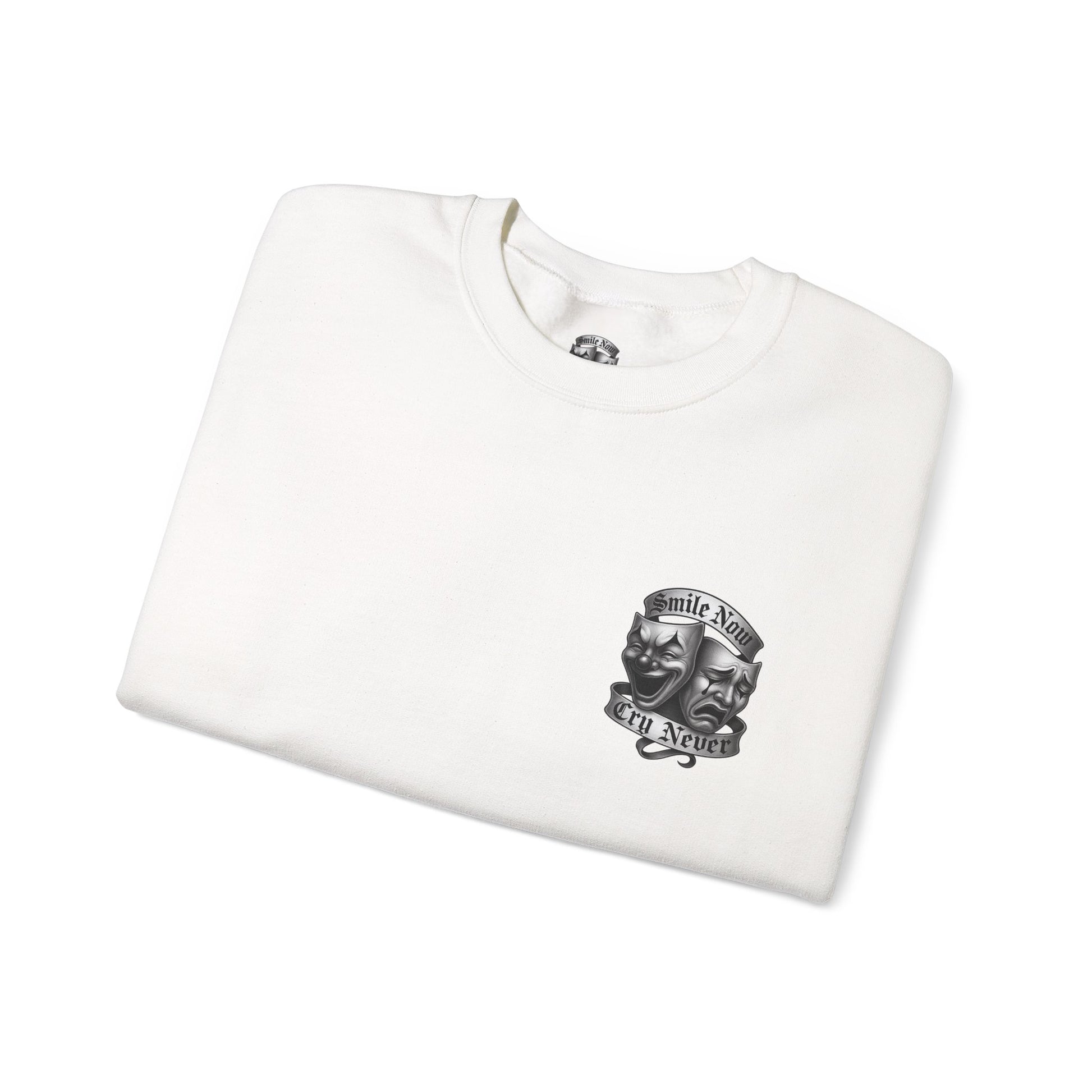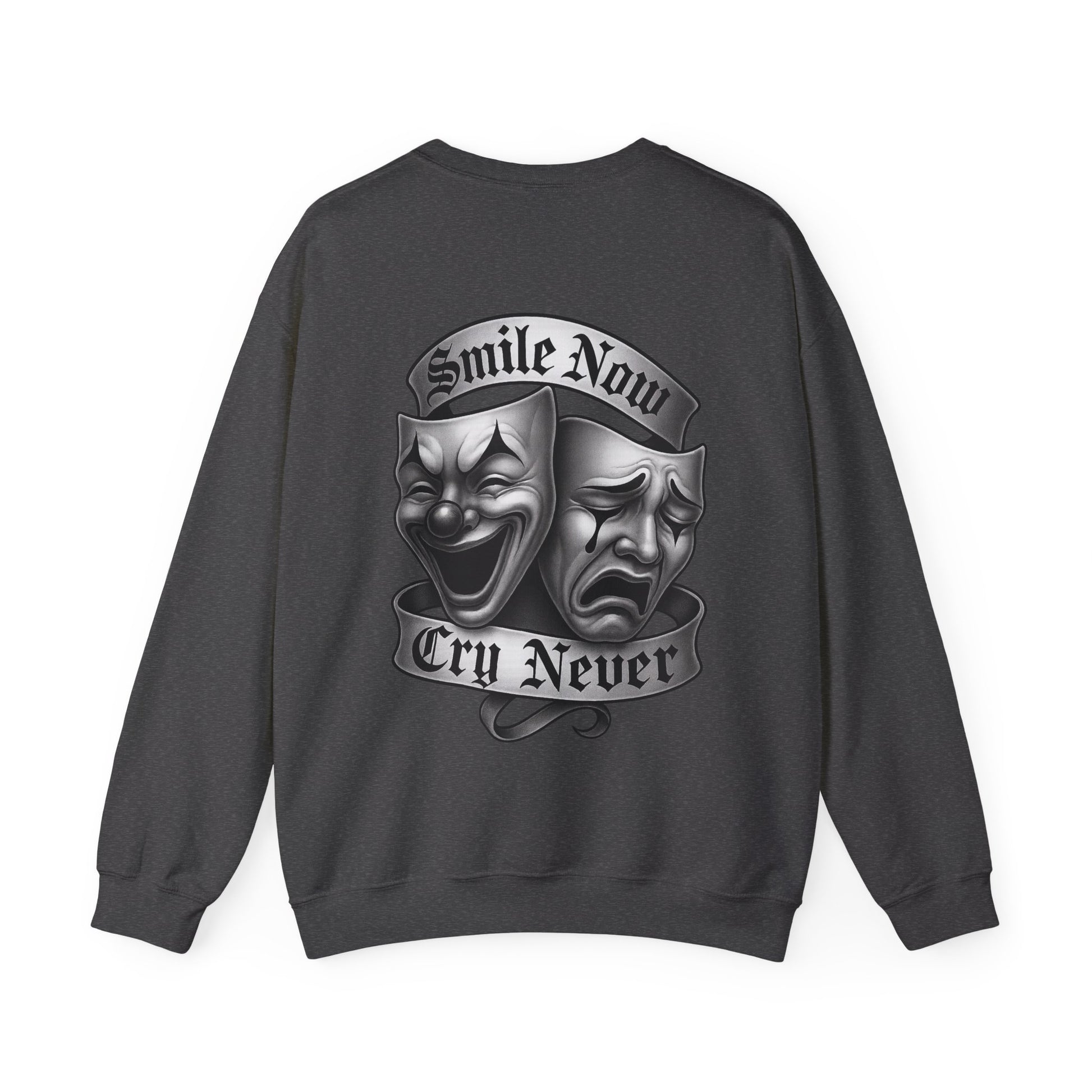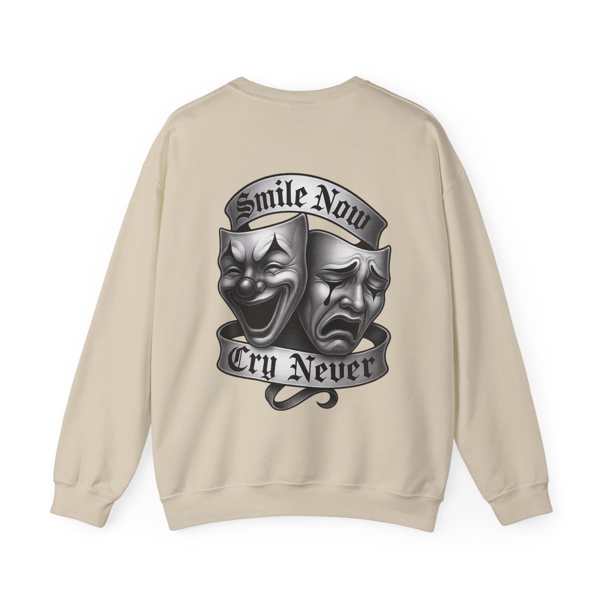 Channel strength through struggle with the “Smile Now, Cry Never” crewneck — a bold twist on the iconic Chicano-style artwork. Featuring two detailed theatrical masks wrapped in vintage script, this design flips the classic phrase to reflect a mindset of resilience and pride.