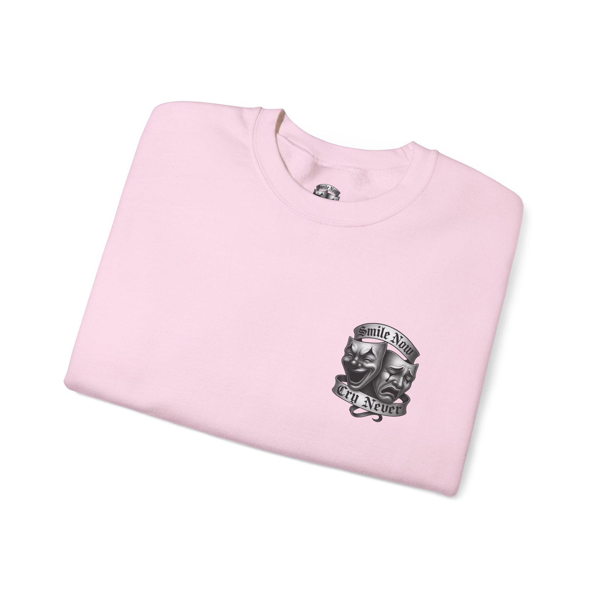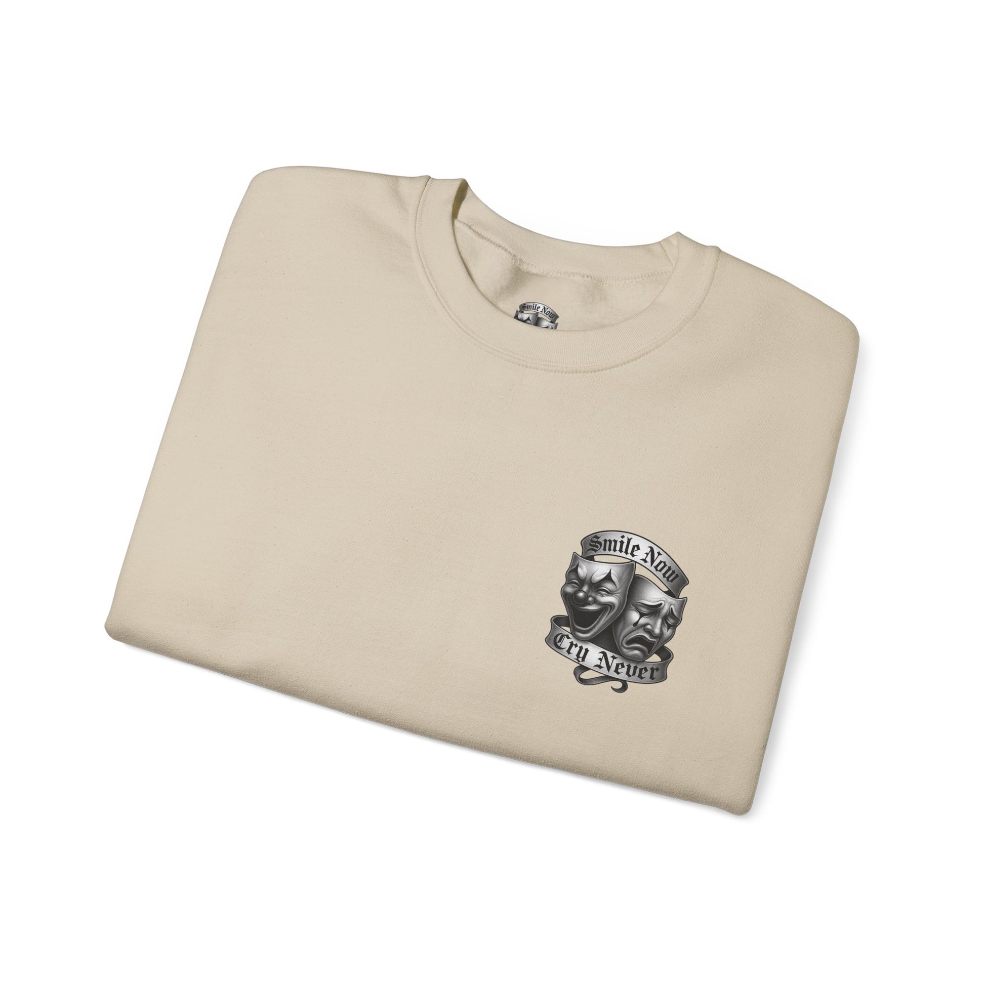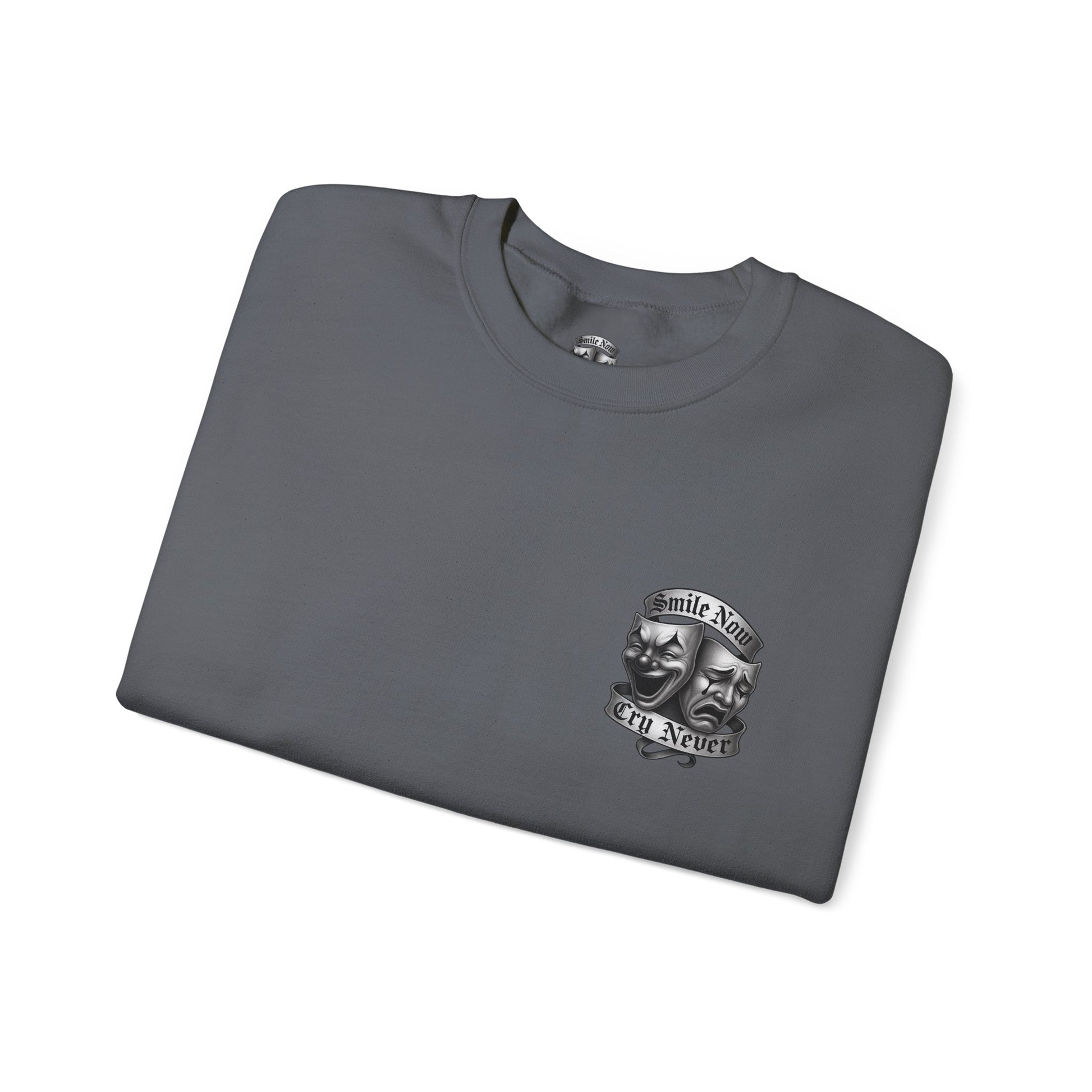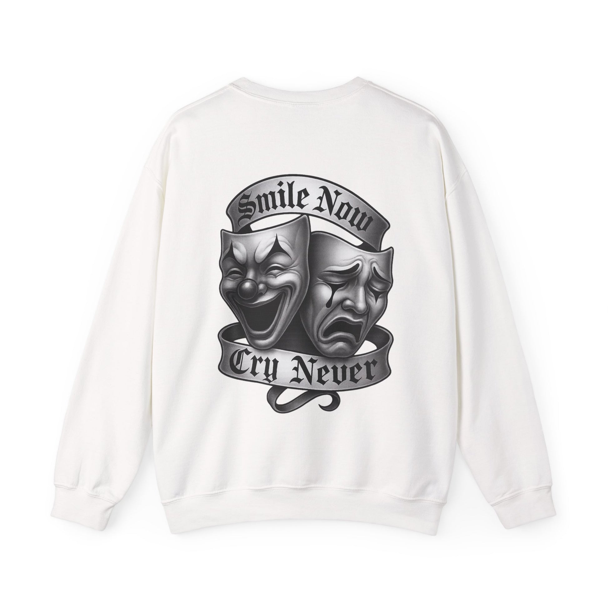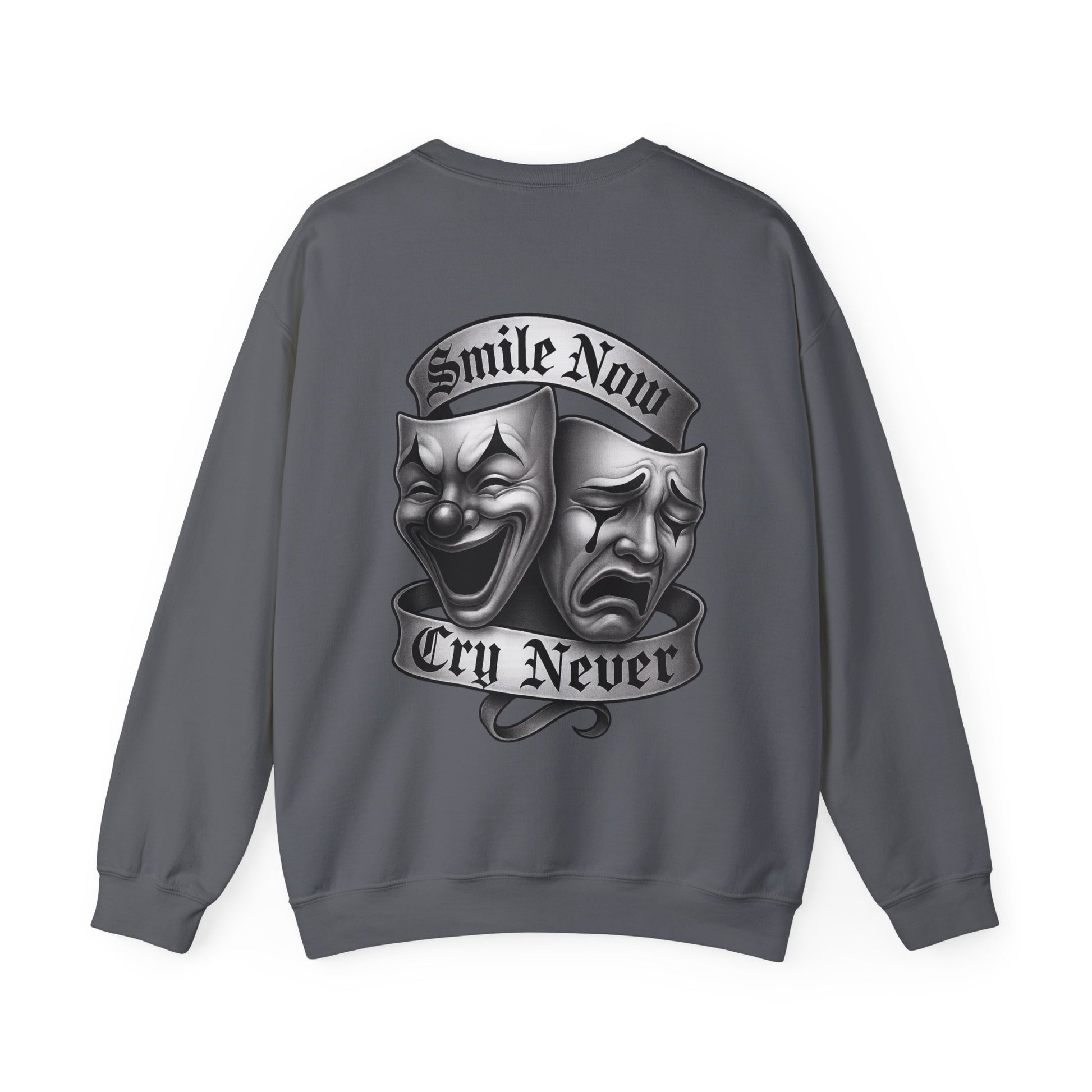 Channel strength through struggle with the “Smile Now, Cry Never” crewneck — a bold twist on the iconic Chicano-style artwork. Featuring two detailed theatrical masks wrapped in vintage script, this design flips the classic phrase to reflect a mindset of resilience and pride.