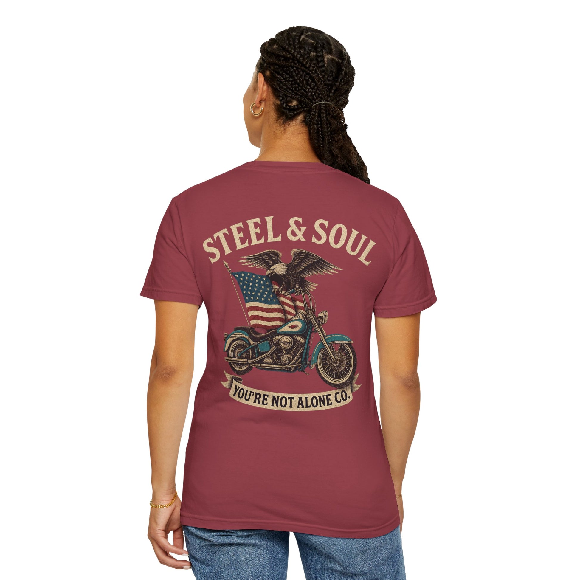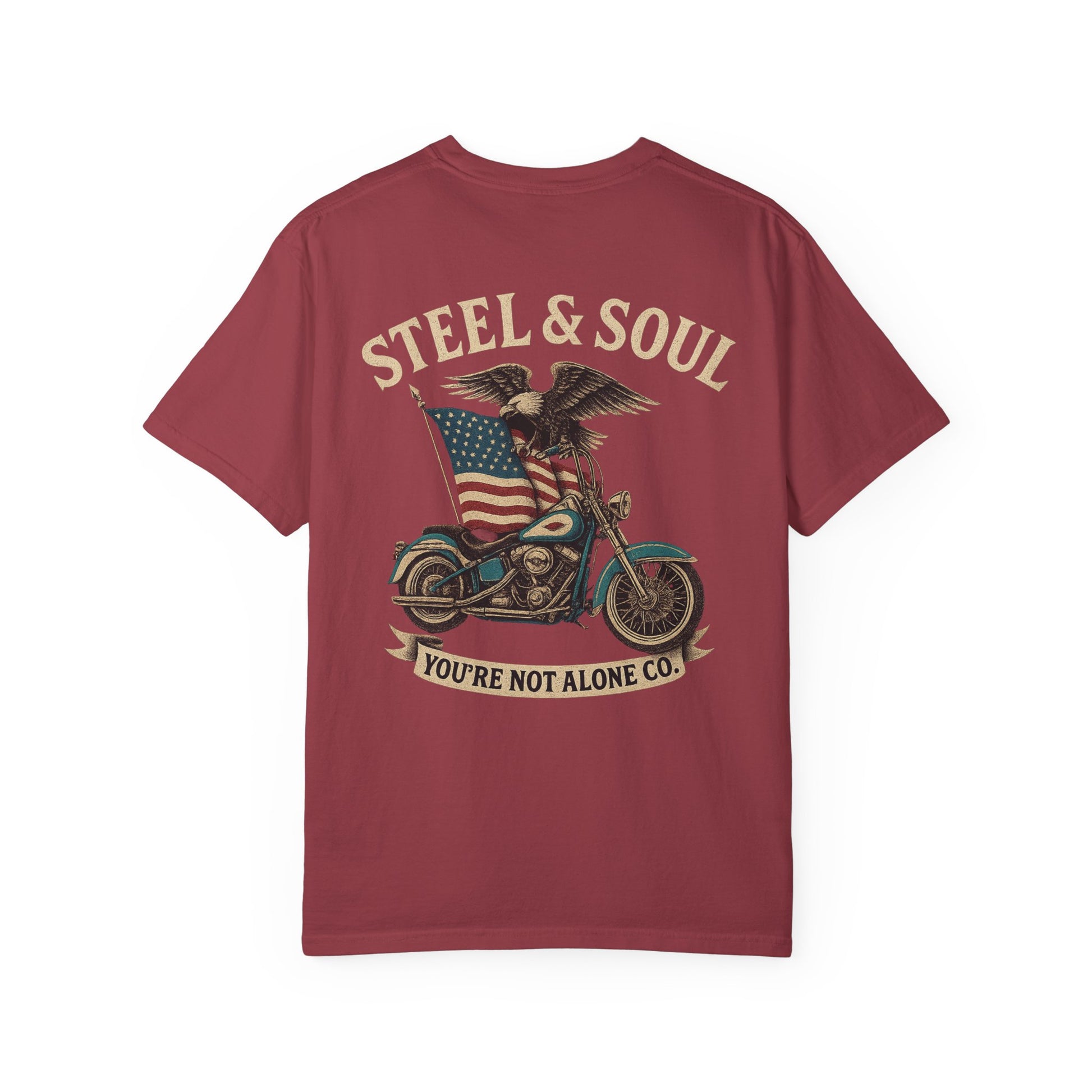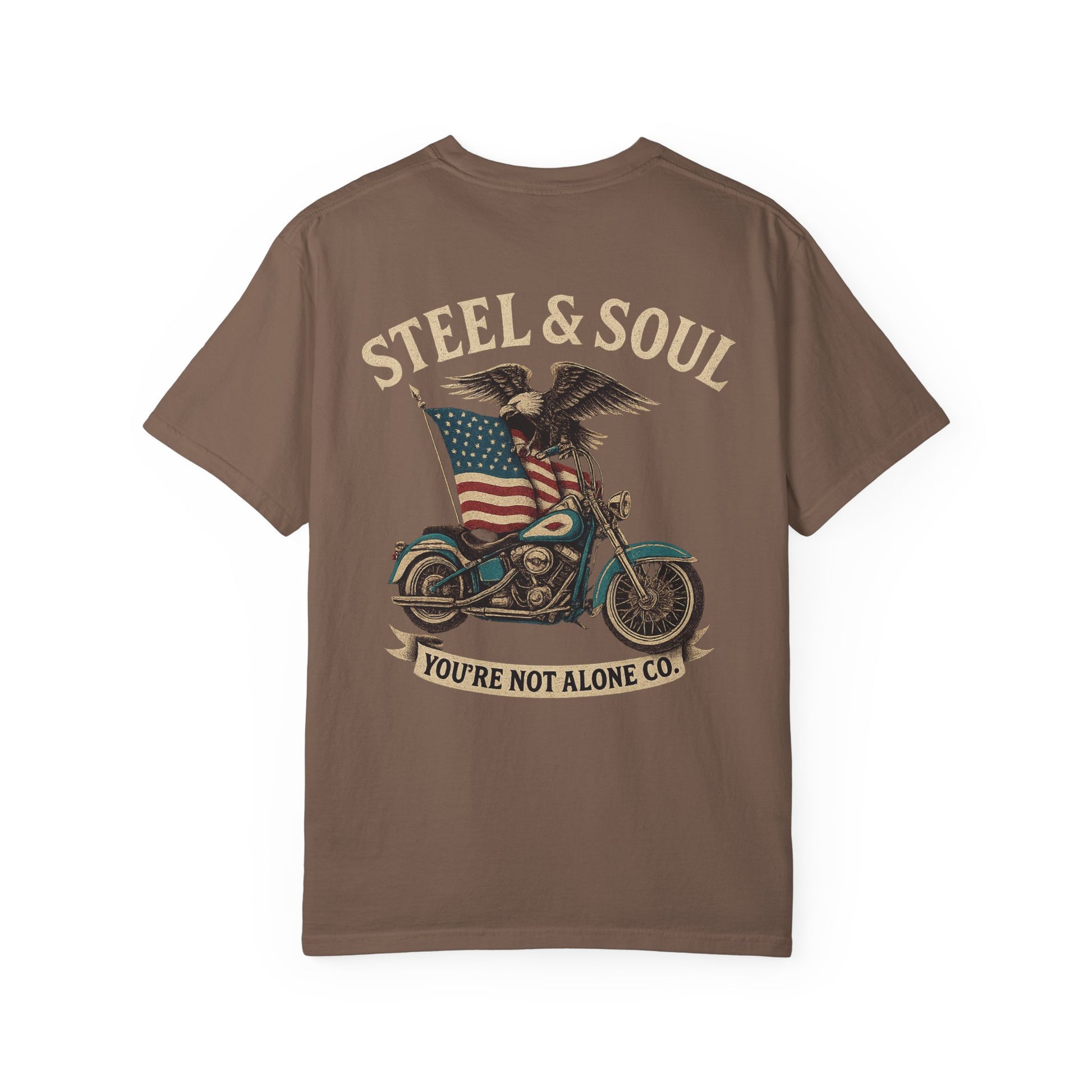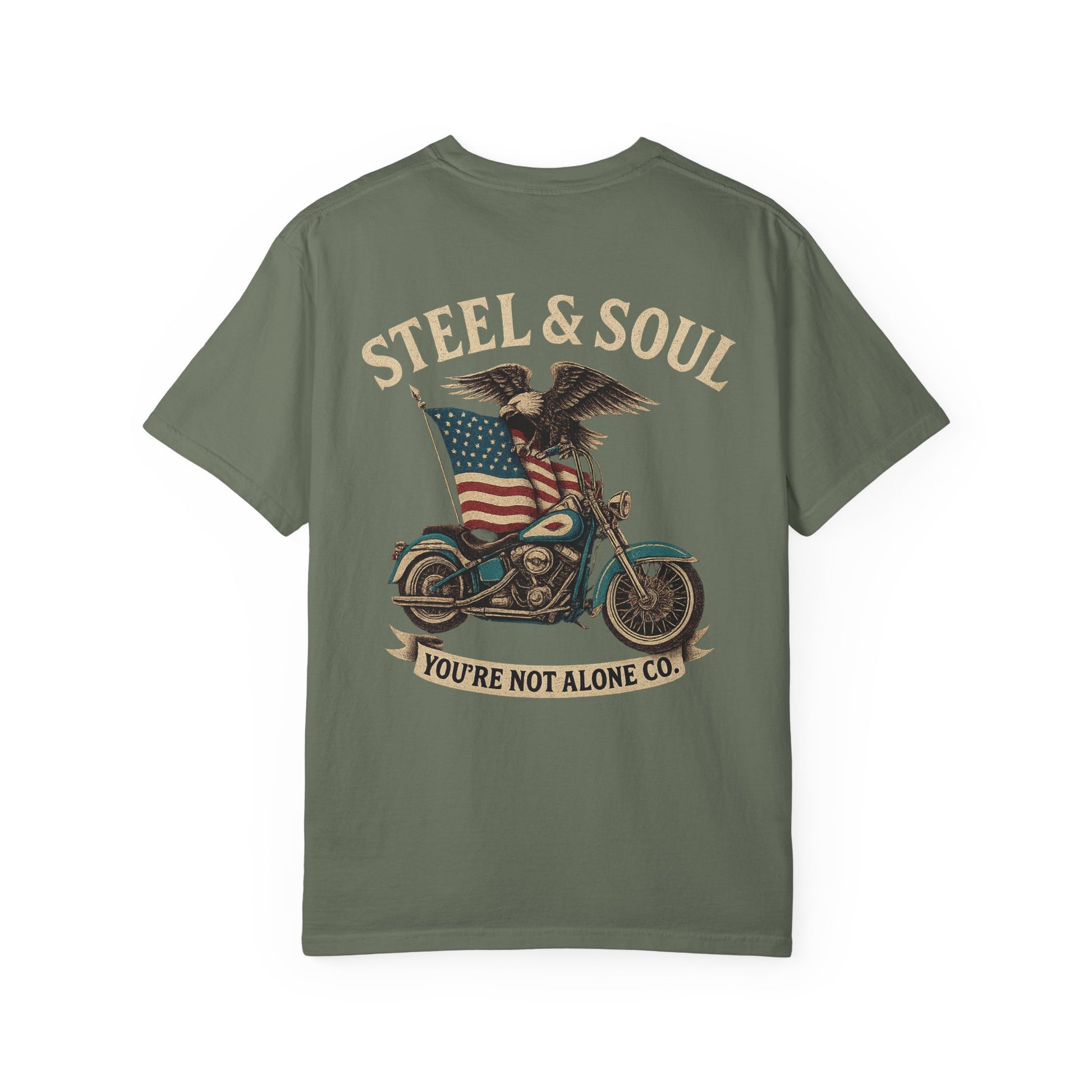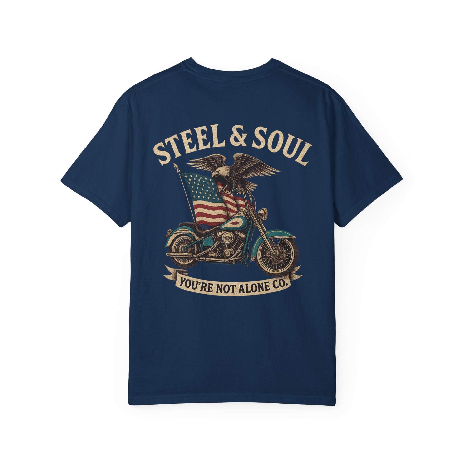 Introducing the Steel & Soul Tee — a unisex garment-dyed t-shirt built for those who ride with meaning and wear their grit with pride. Featuring a vintage-style back print of a custom turquoise Harley, American flag, and soaring eagle, this shirt brings freedom, legacy, and soul to life.