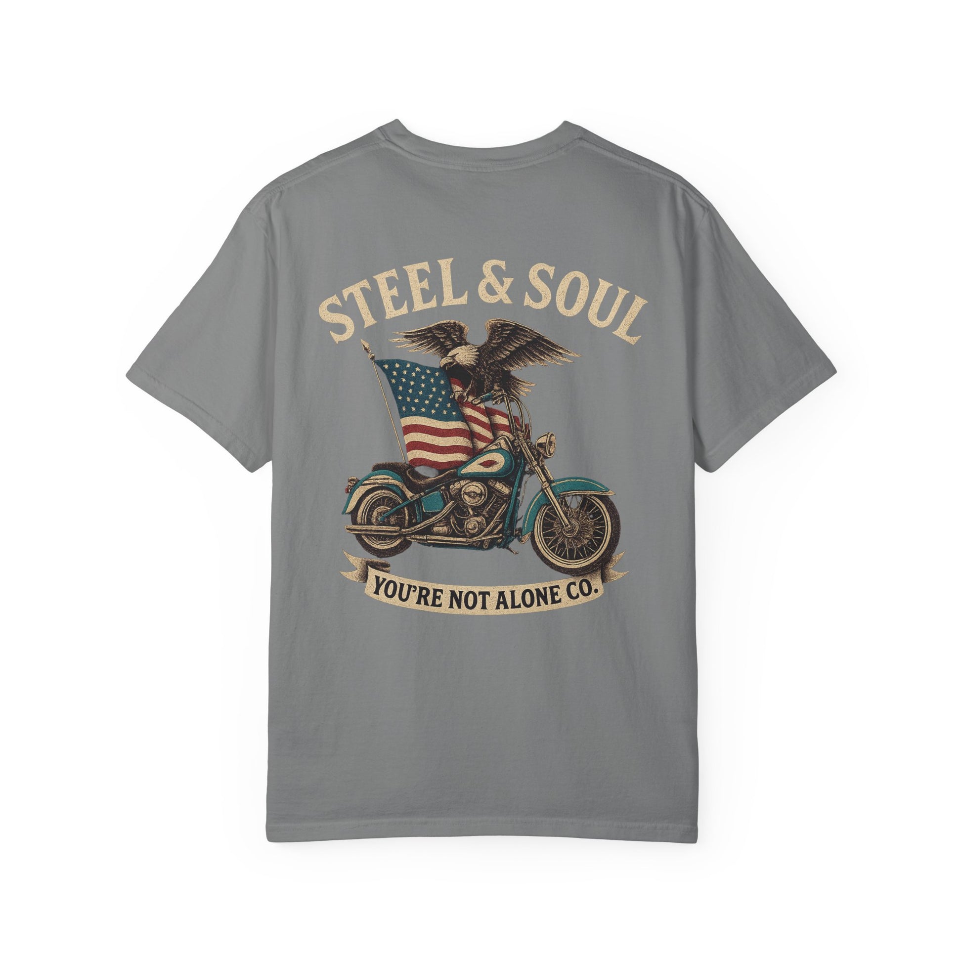 Crafted from 100% ring-spun US cotton, it delivers that soft, broken-in comfort that feels better with every wear. Whether you're cruising the streets or posted with your crew, this shirt stands for more than just style—it's a statement. It's Steel & Soul.