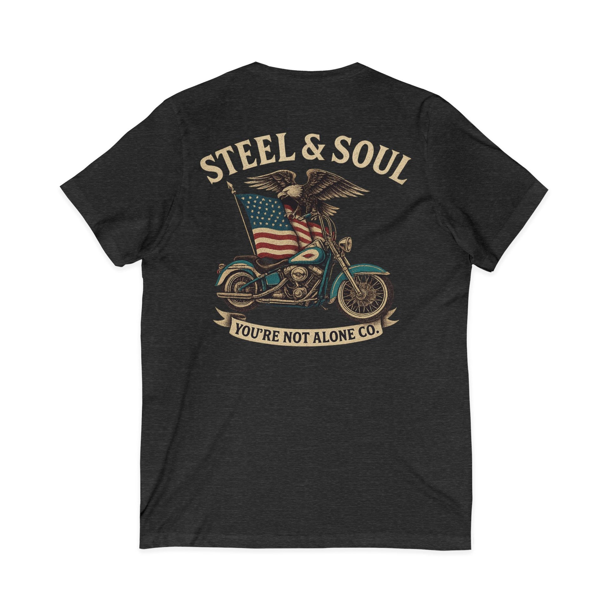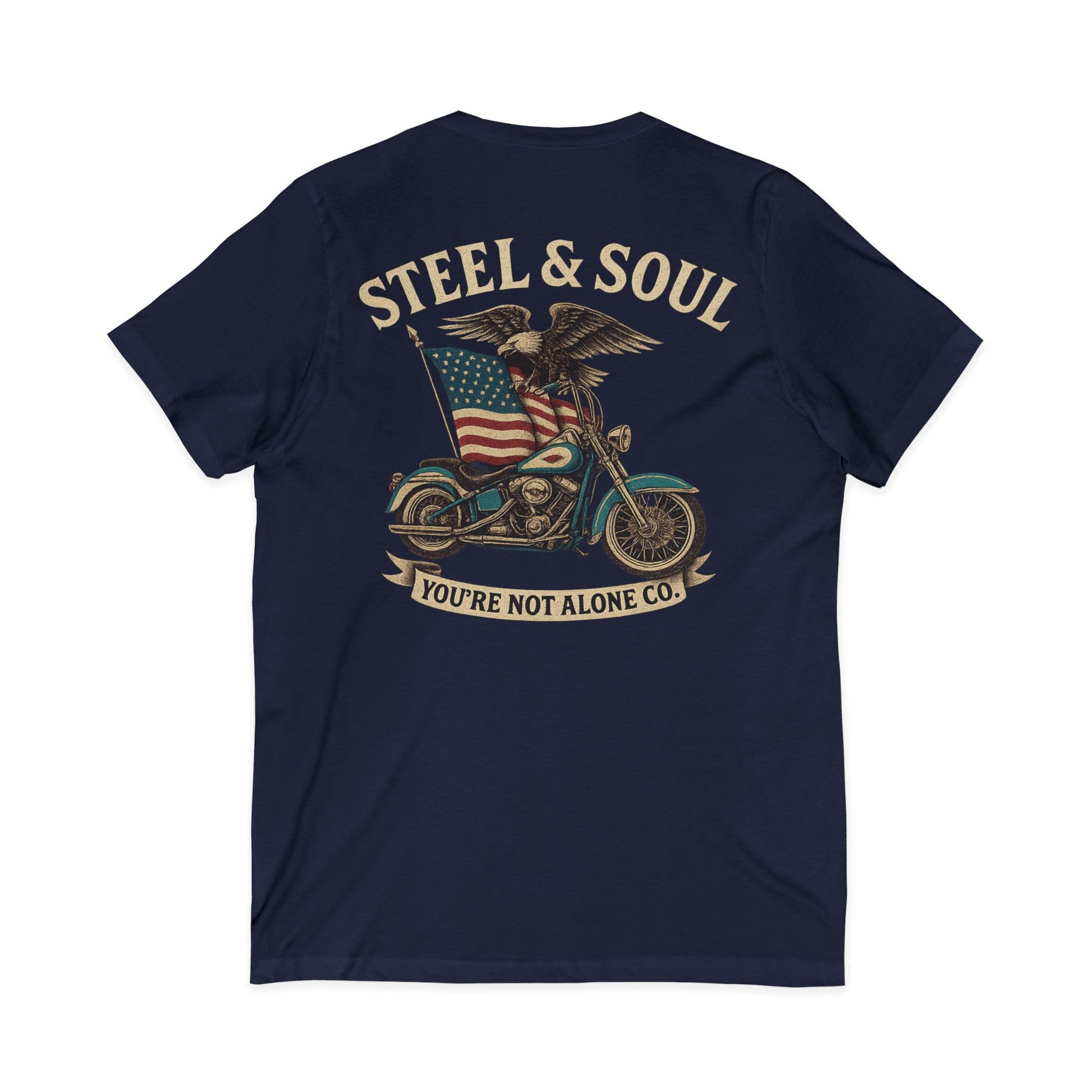 Introducing the Steel & Soul Tee — a unisex garment-dyed t-shirt built for those who ride with meaning and wear their grit with pride. Featuring a vintage-style back print of a custom turquoise Harley, American flag, and soaring eagle, this shirt brings freedom, legacy, and soul to life.