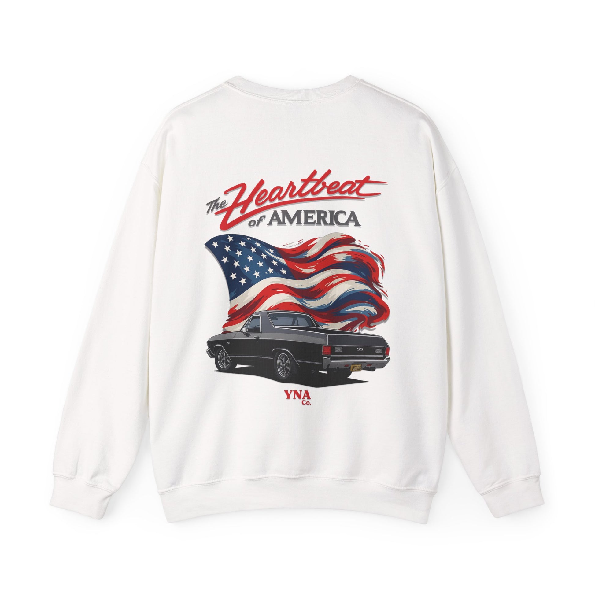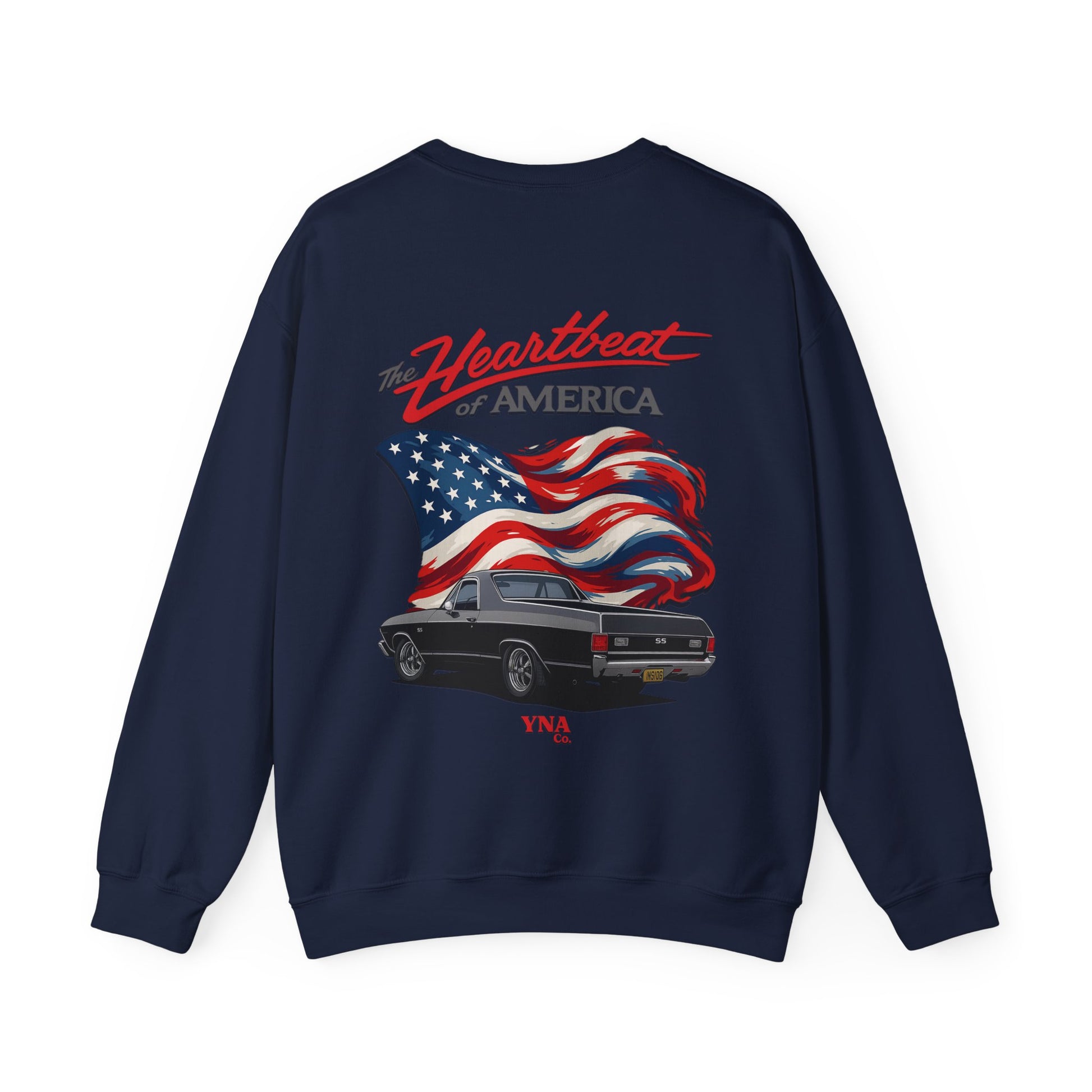 Inspired by chrome, horsepower, and heritage—The Heartbeat of America II Crewneck blends retro muscle car vibes with bold American pride. Featuring a hand-detailed lowrider, vintage flag flow, and classic script, this design pays tribute to the culture that raised us and the rides that carried us.