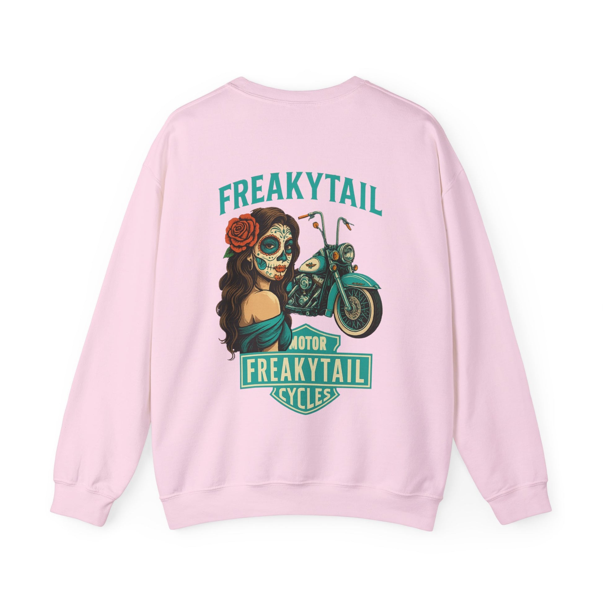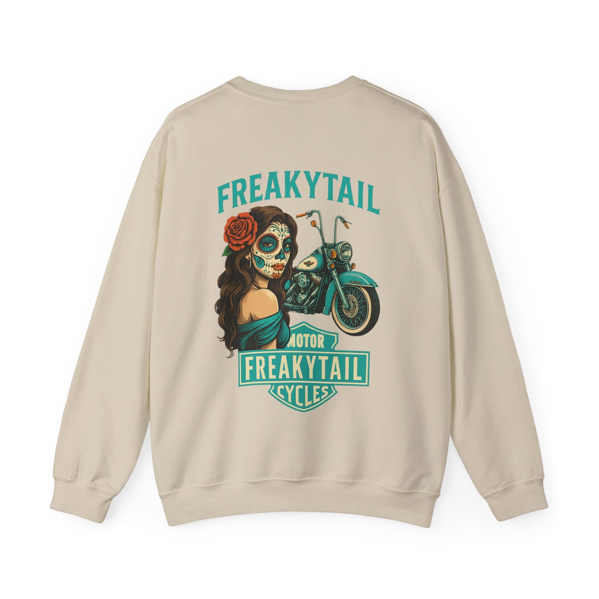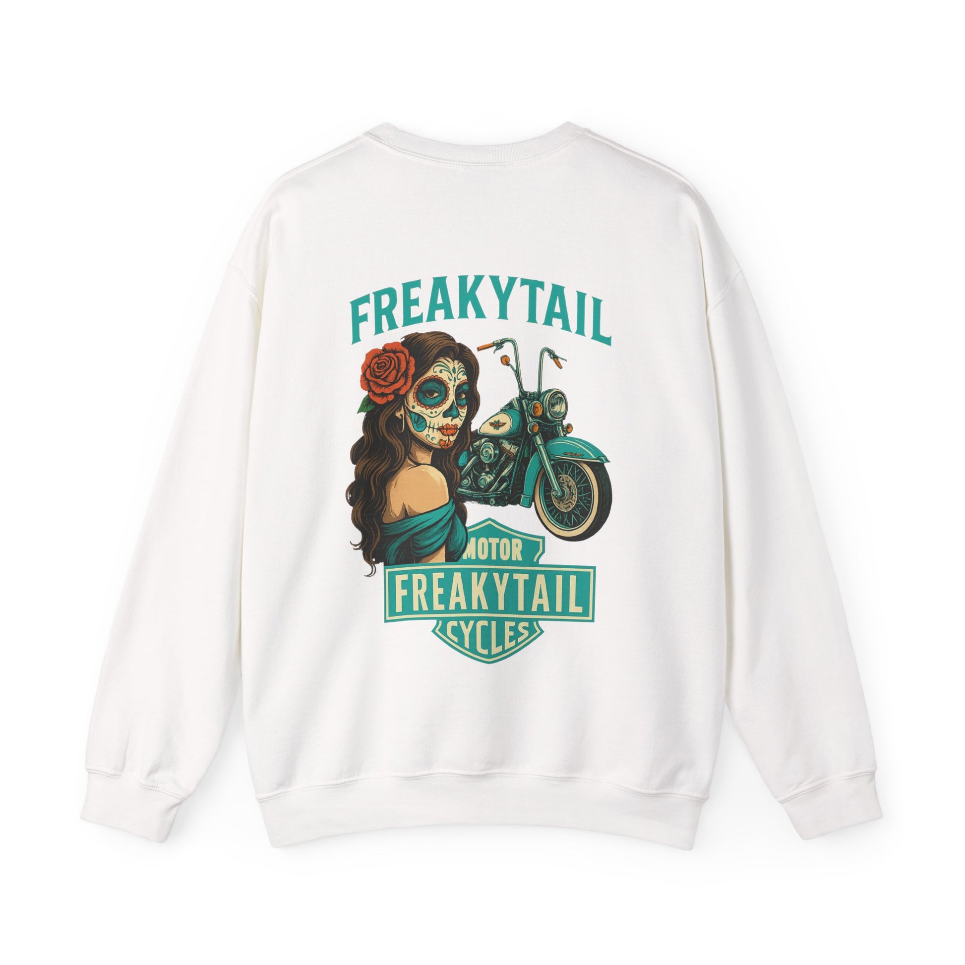 The YNA x FREAKYTAIL “Día De Los Muertos” Crewneck fuses Chicano-inspired artwork with motorcycle culture. Featuring a striking sugar skull mujer, turquoise Harley, and the bold FREAKYTAIL CYCLES badge, this design celebrates heritage, resilience, and West Coast street energy.