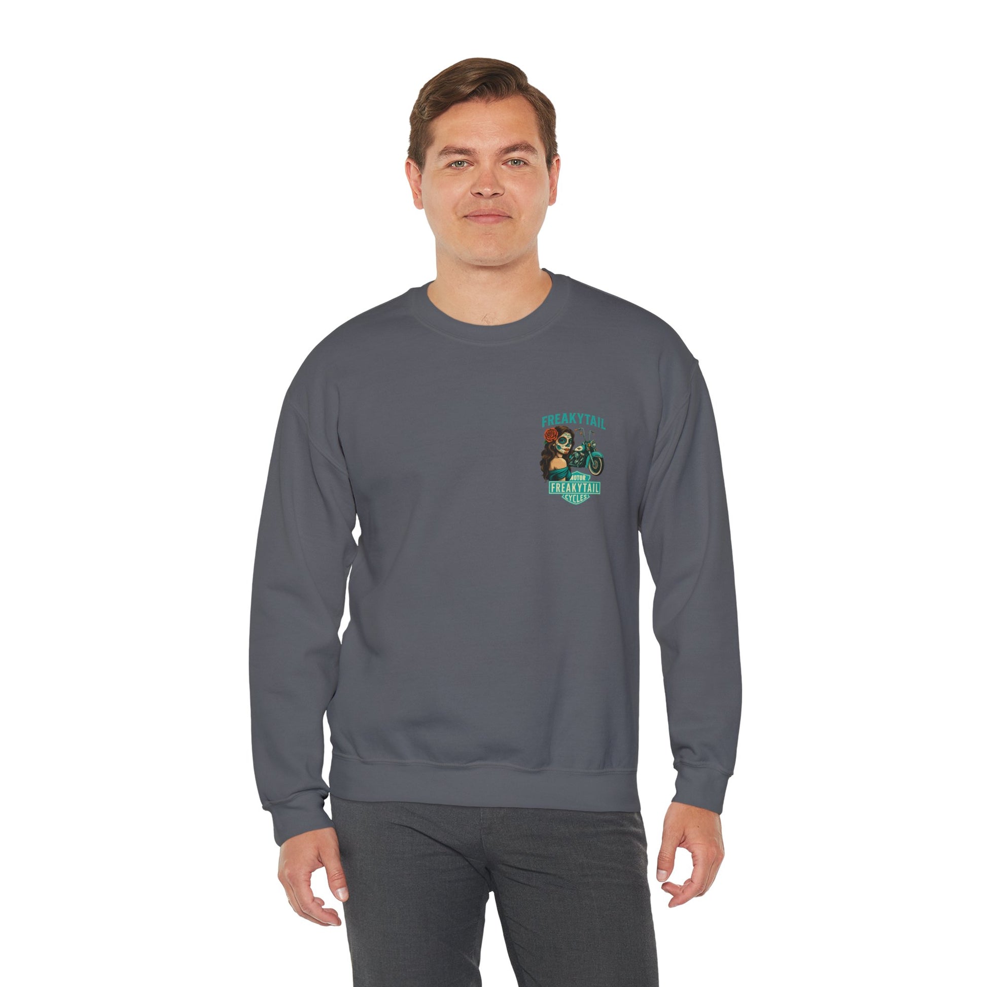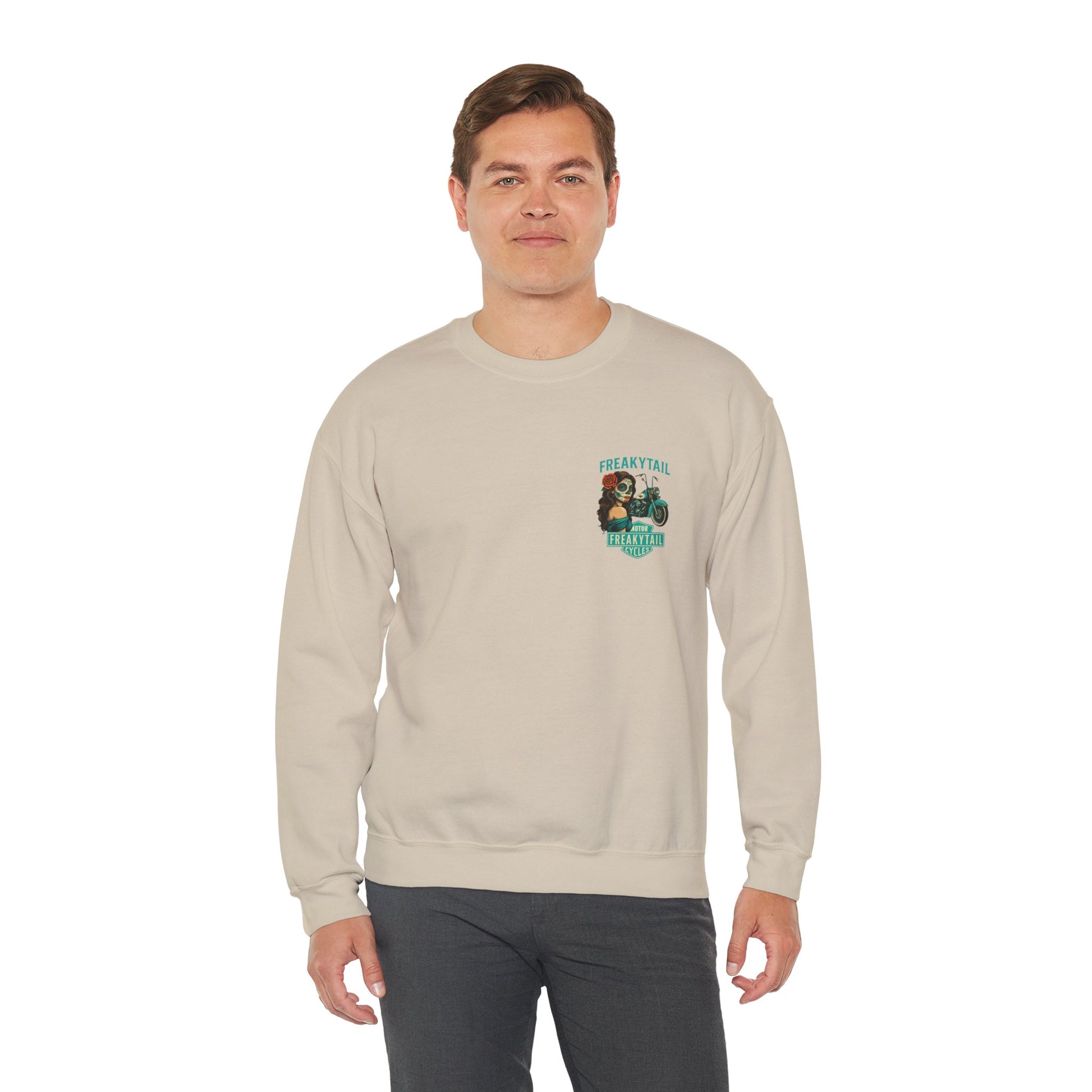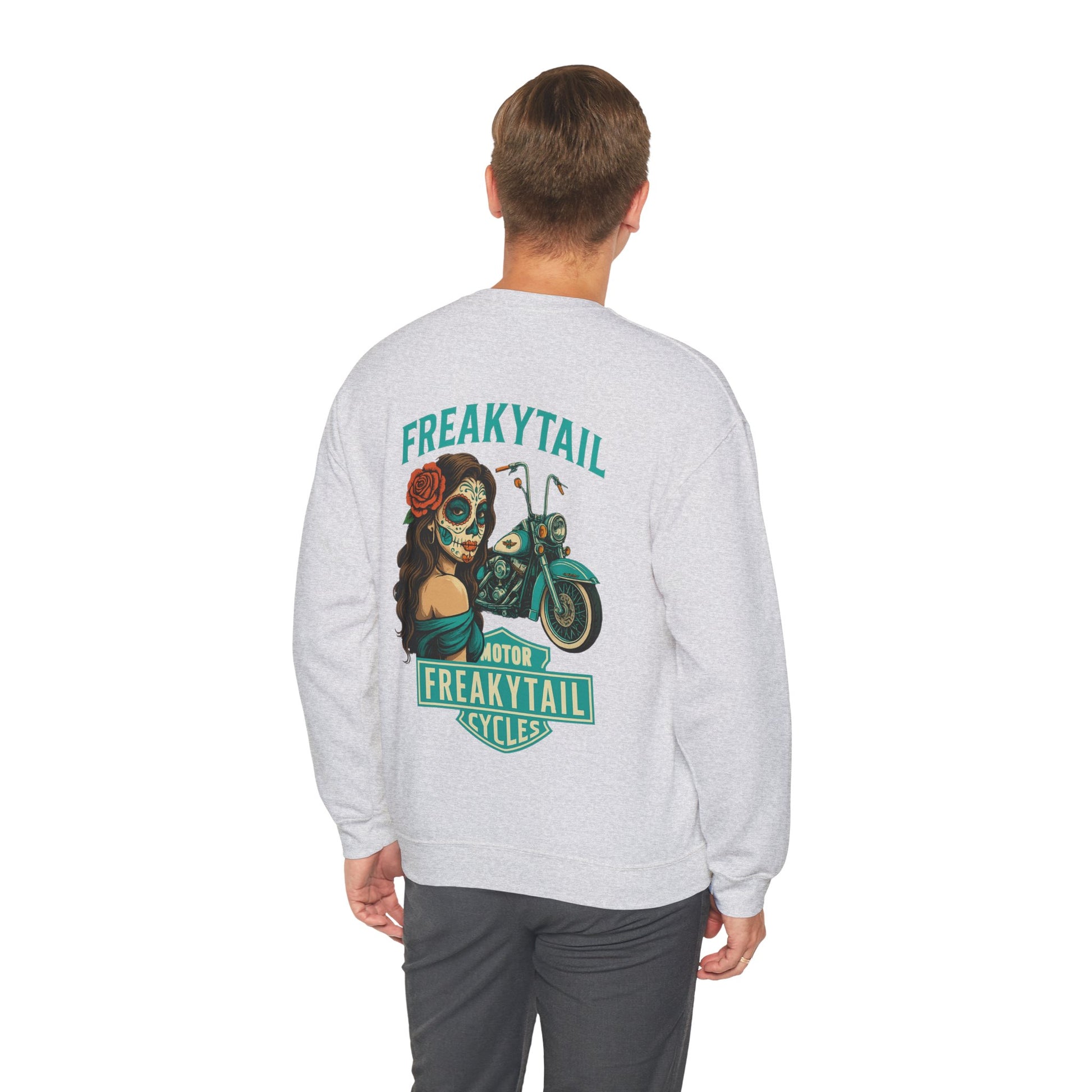 The YNA x FREAKYTAIL “Día De Los Muertos” Crewneck fuses Chicano-inspired artwork with motorcycle culture. Featuring a striking sugar skull mujer, turquoise Harley, and the bold FREAKYTAIL CYCLES badge, this design celebrates heritage, resilience, and West Coast street energy.