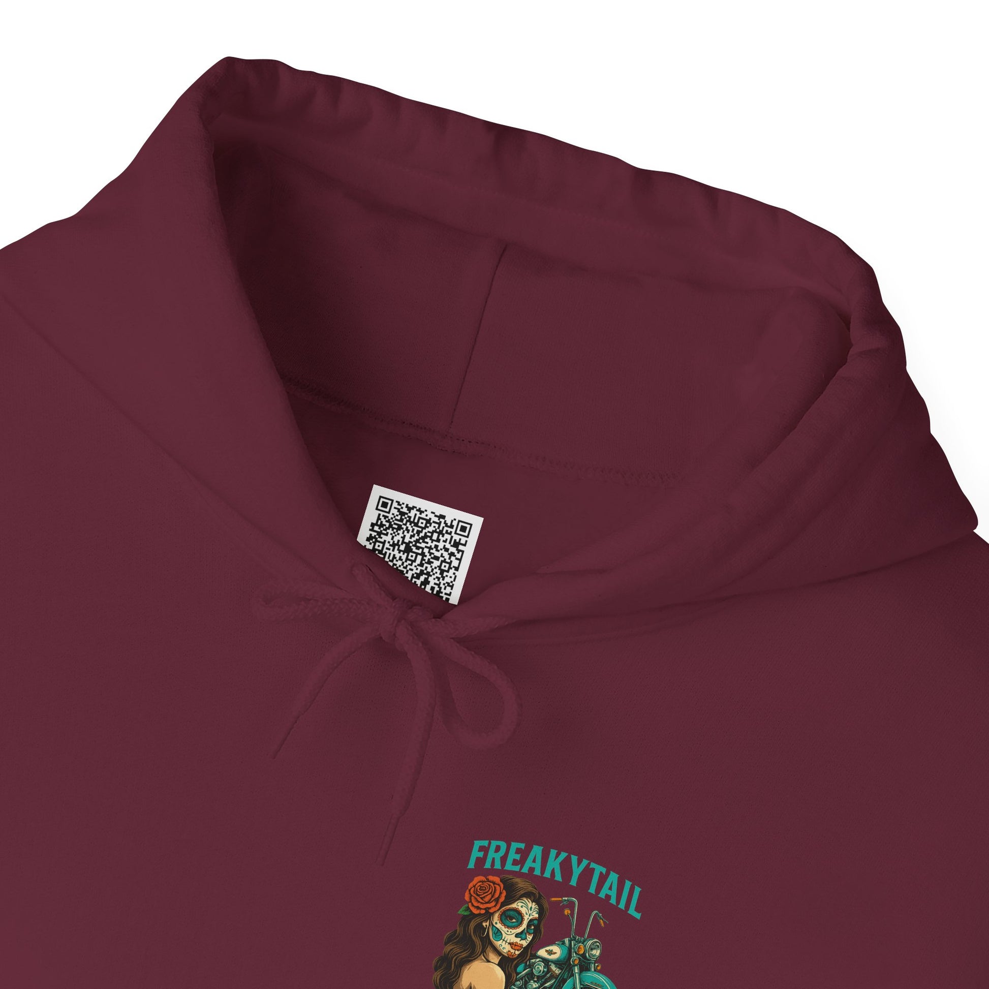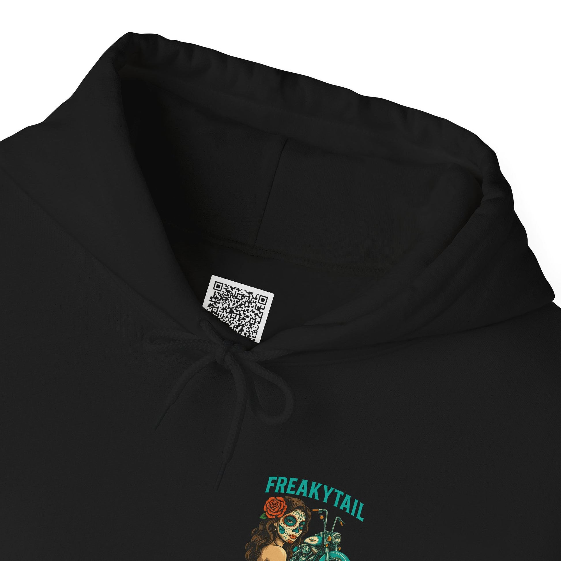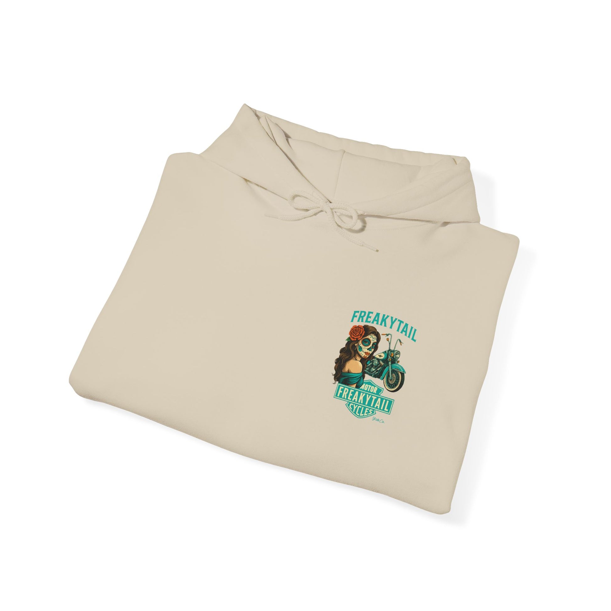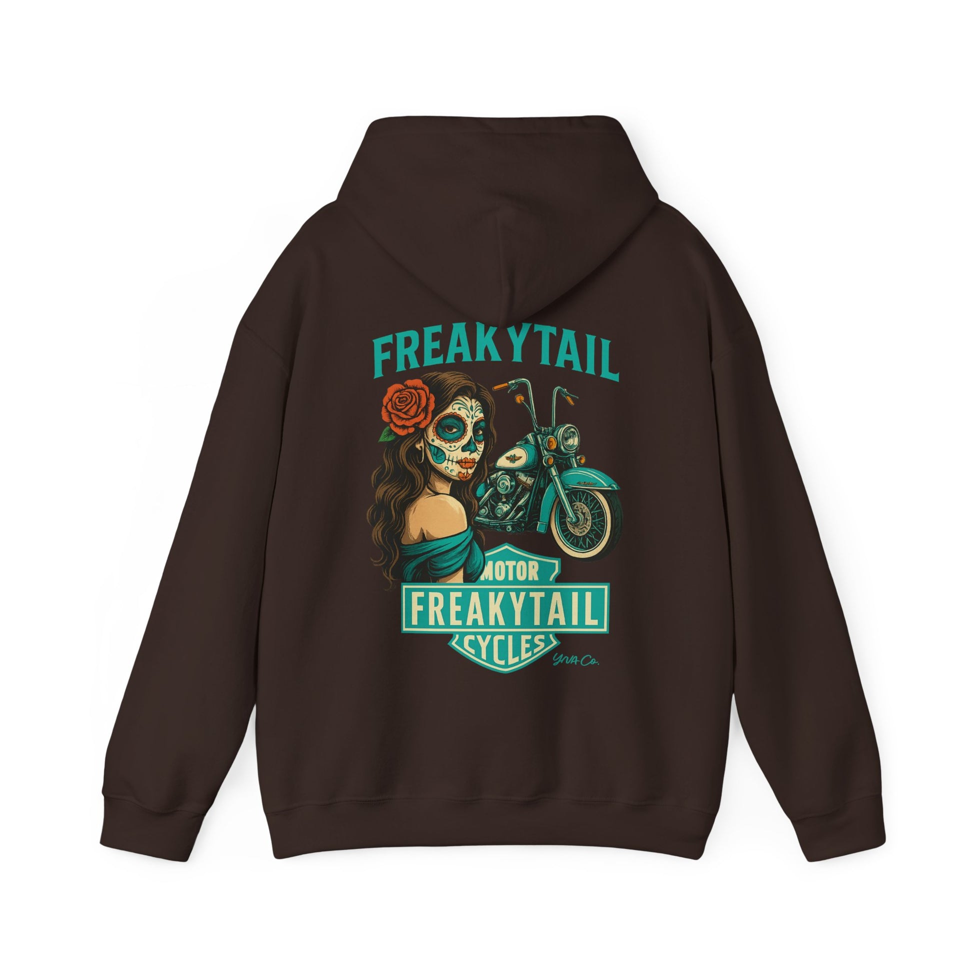 The YNA x FREAKYTAIL “Día De Los Muertos” Hoodie fuses Chicano-inspired artwork with motorcycle culture. Featuring a striking sugar skull mujer, turquoise Harley, and the bold FREAKYTAIL CYCLES badge, this design celebrates heritage, resilience, and West Coast street energy.