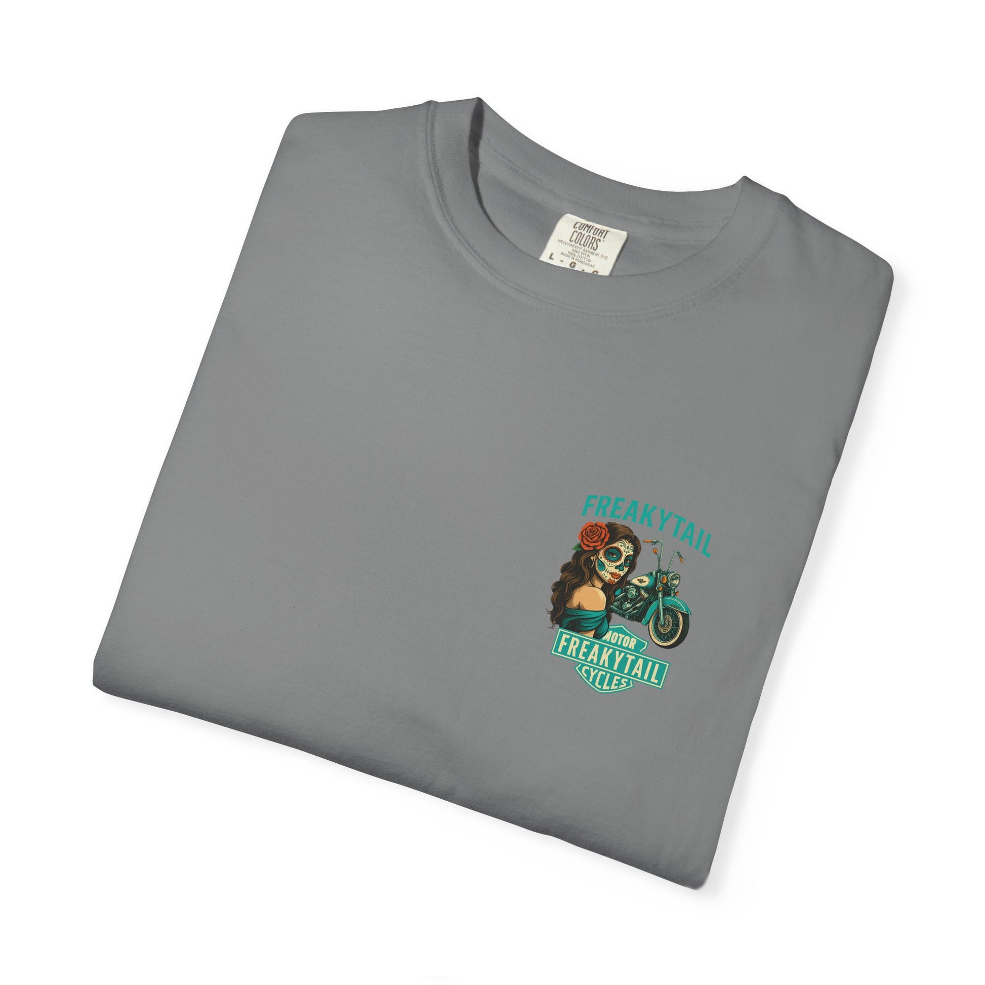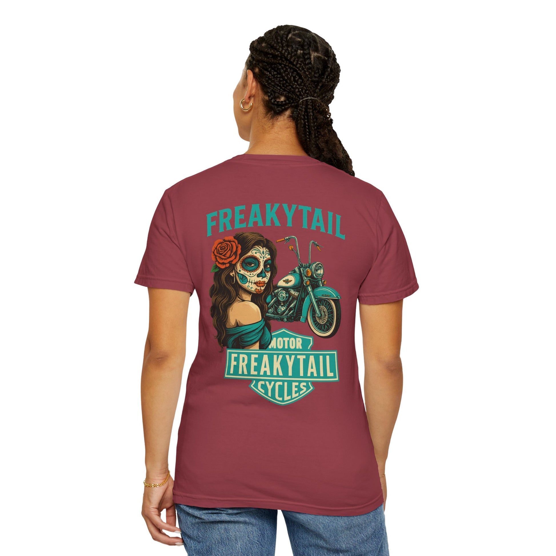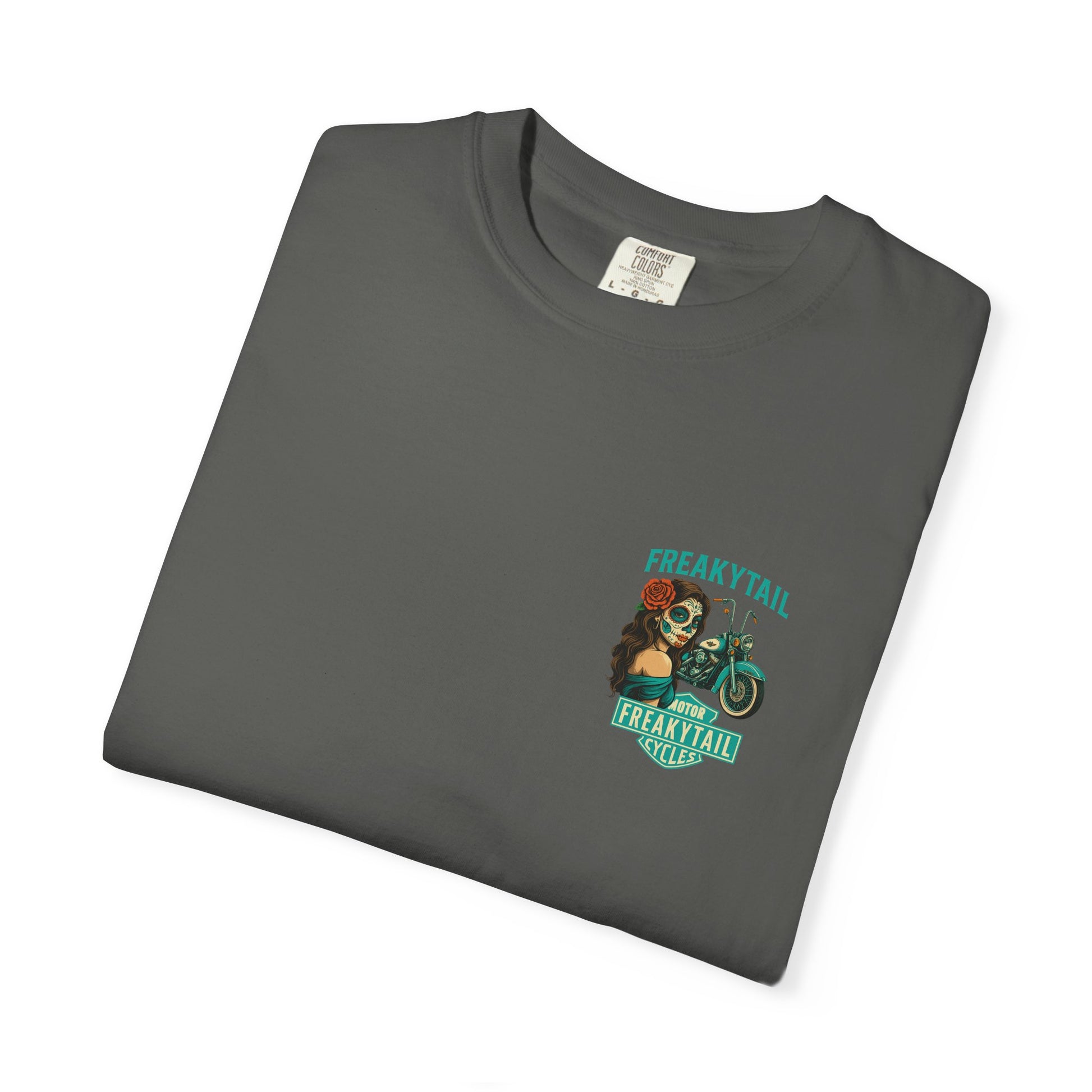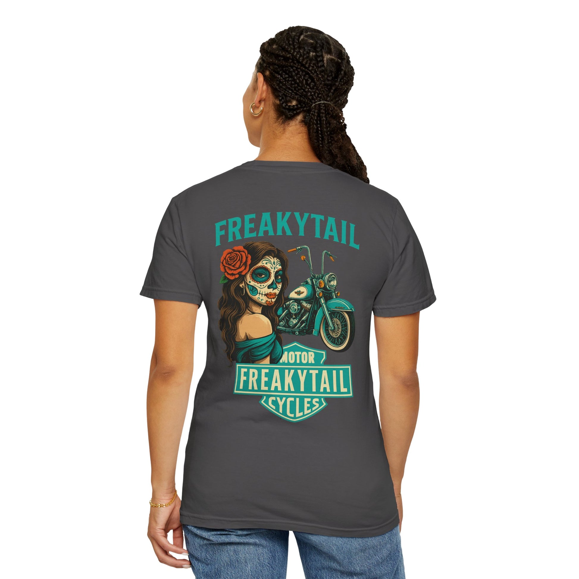 The YNA x FREAKYTAIL “Día De Los Muertos” Tee fuses Chicano-inspired artwork with motorcycle culture. Featuring a striking sugar skull mujer, turquoise Harley, and the bold FREAKYTAIL CYCLES badge, this design celebrates heritage, resilience, and West Coast street energy.